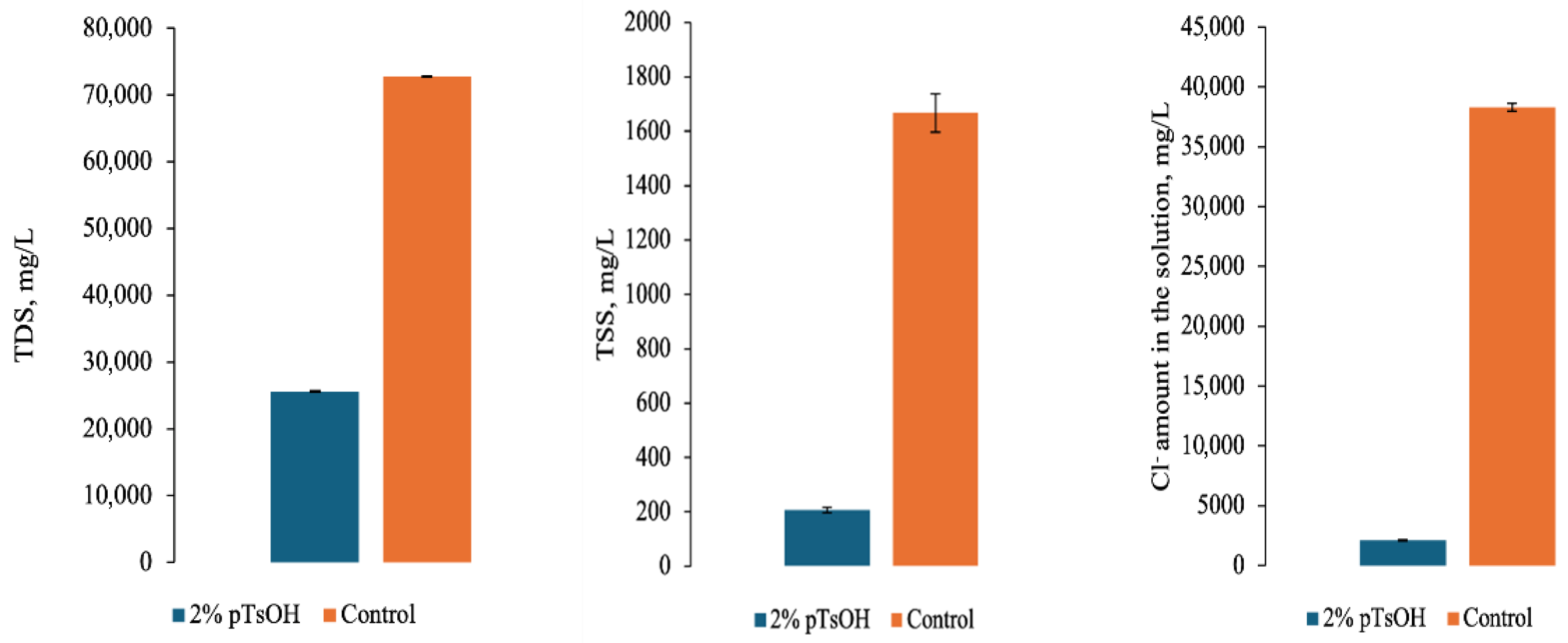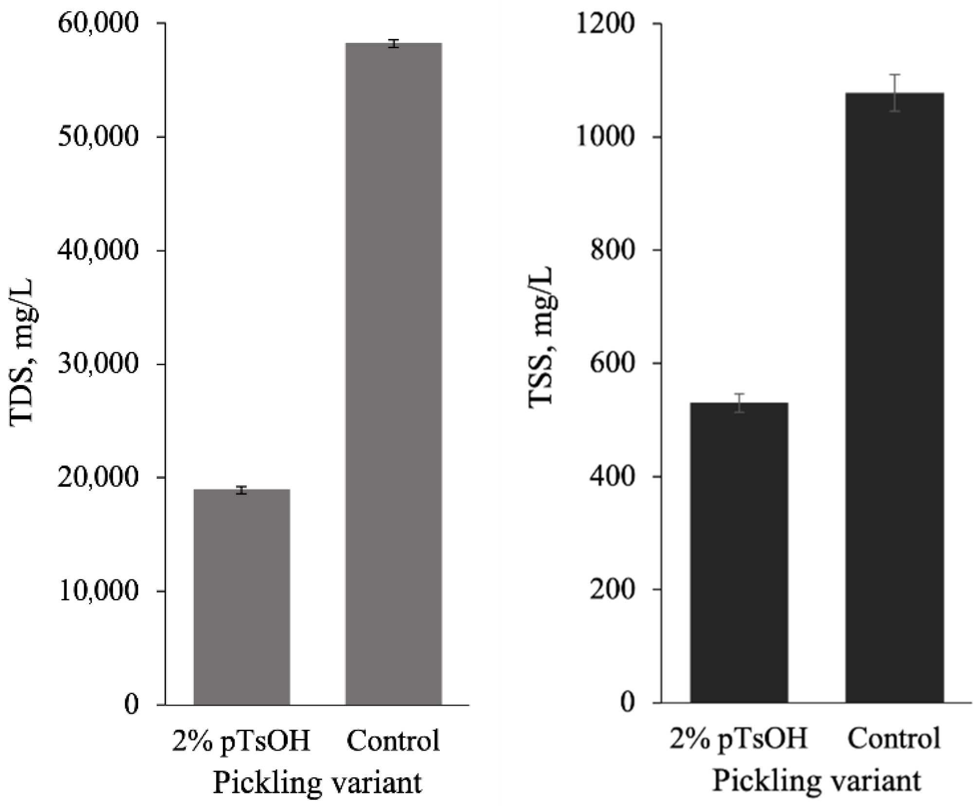The results showed that after the experimental process, the concentration of TDS in the wastewater was lower than after conventional pickling; in the latter case, there were more than 2.8 times more dissolved solids than after treatment with pTsOH. Furthermore, after determining TSS in the solutions, it was found that pickling with pTsOH had an advantage, as there were eight times fewer such particles than when using NaCl and sulfuric acid. Lastly, chlorides in the effluent were also analyzed.
