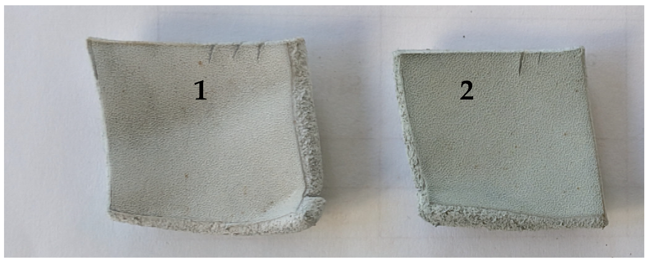 An increased shrinkage temperature might be explained not only by the fact that sulfonic acids can bond to side chains of collagen to stabilize the structure of leather [25] but also by the fact that during chrome tanning, more chromium compounds bonded to hide, which led to better chromium compound exhaustion. Pickling with pTsOH had a positive effect on the consumption of chromium compounds and on their amount in the semi-finished product. Accordingly, more cross-links between collagen and chromium were formed during the process, which increased the thermostability of the hide. After chrome tanning, when visually comparing the solutions collected after the process, the amount of chromium compounds in the experimental variant solution was lower than in the control (Figure 2).