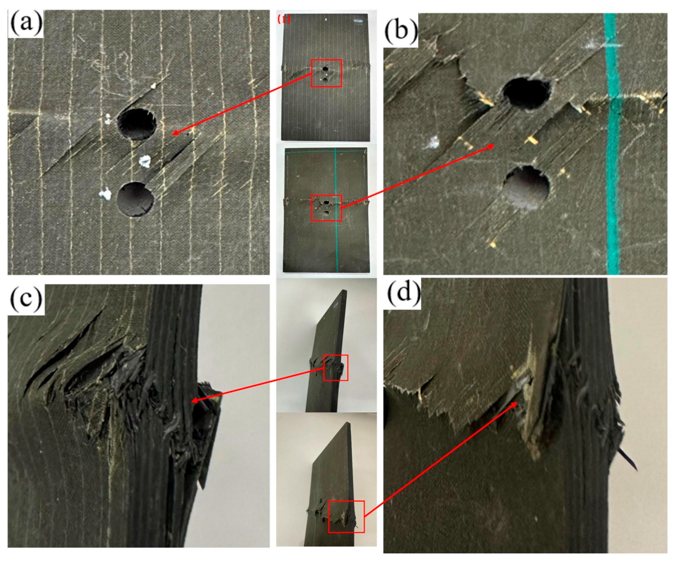 - Zhang, D.; Zhou, J.; Wang, J.; Zhang, W.; Guan, Z. A comparative study on failure mechanisms of open-hole and filled-hole composite laminates: Experiment and numerical simulation. Thin Walled Struct. 2024, 198, 111730. [Google Scholar]