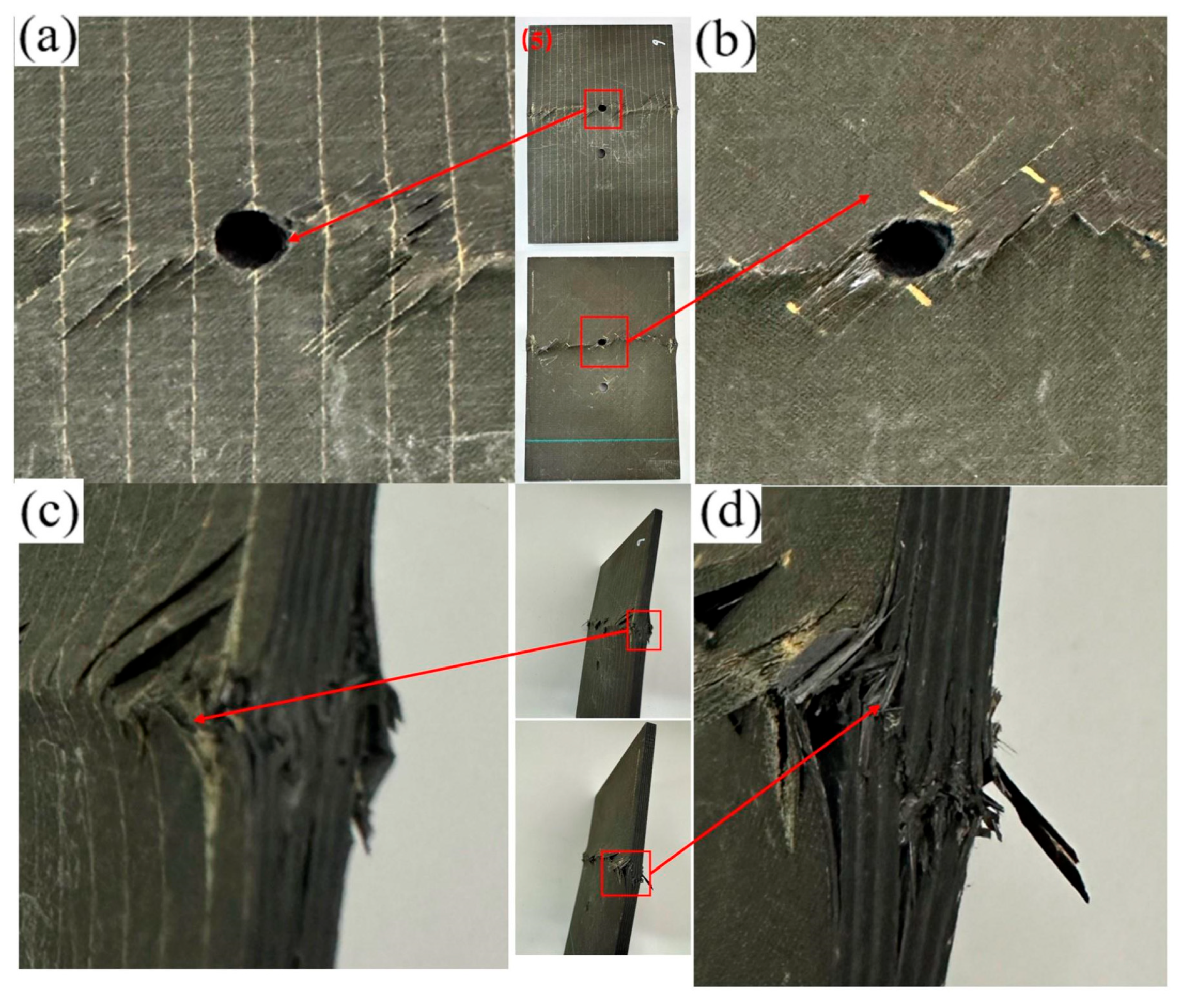 - Zhou, S.; Zhang, J.; Sun, Y.; Tian, K. Experimental and numerical investigation of open-hole carbon fiber composite laminates under compression with three different stacking sequences. J. Mater. Res. Technol. 2019, 8, 2957–2968. [Google Scholar] [CrossRef]