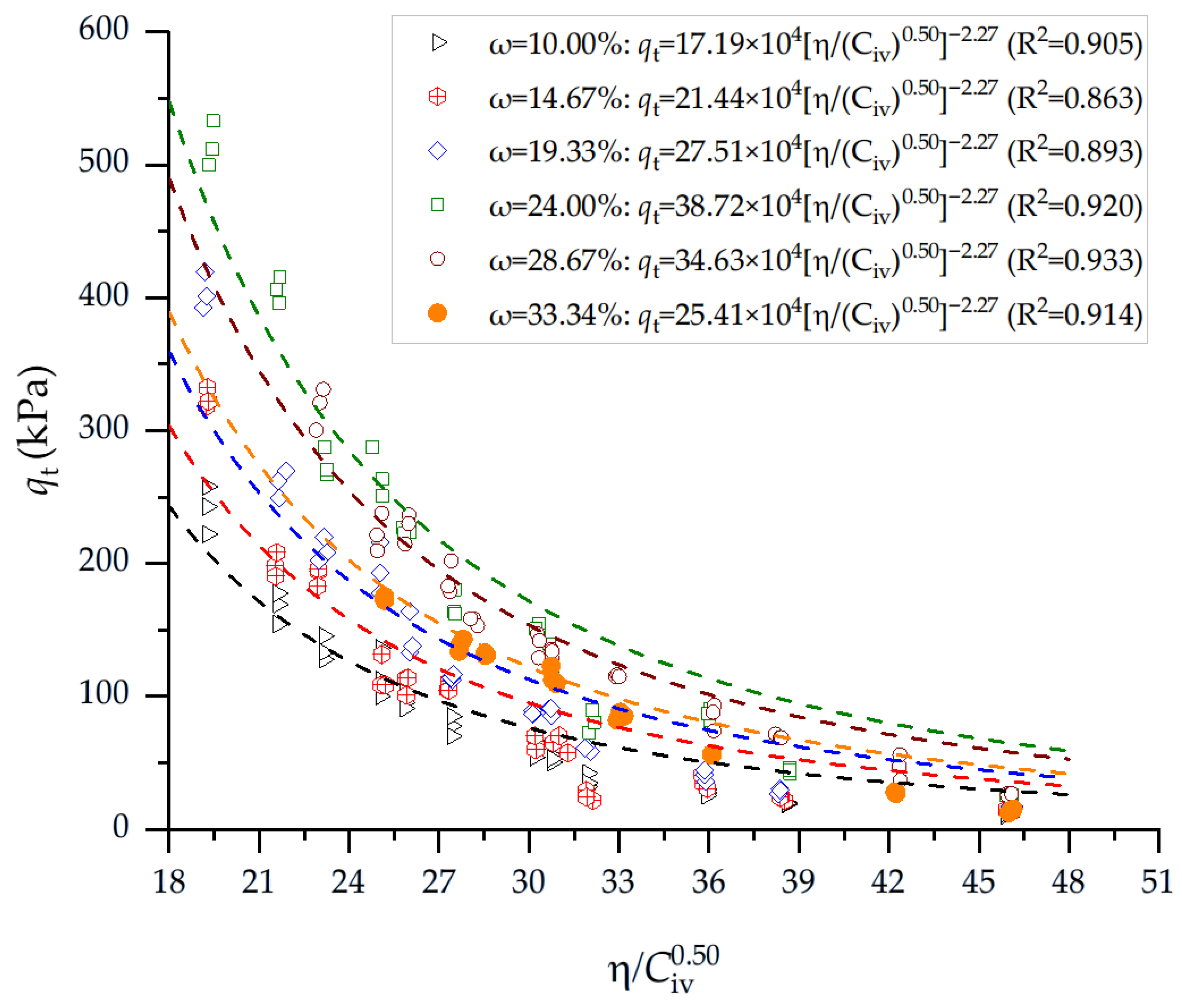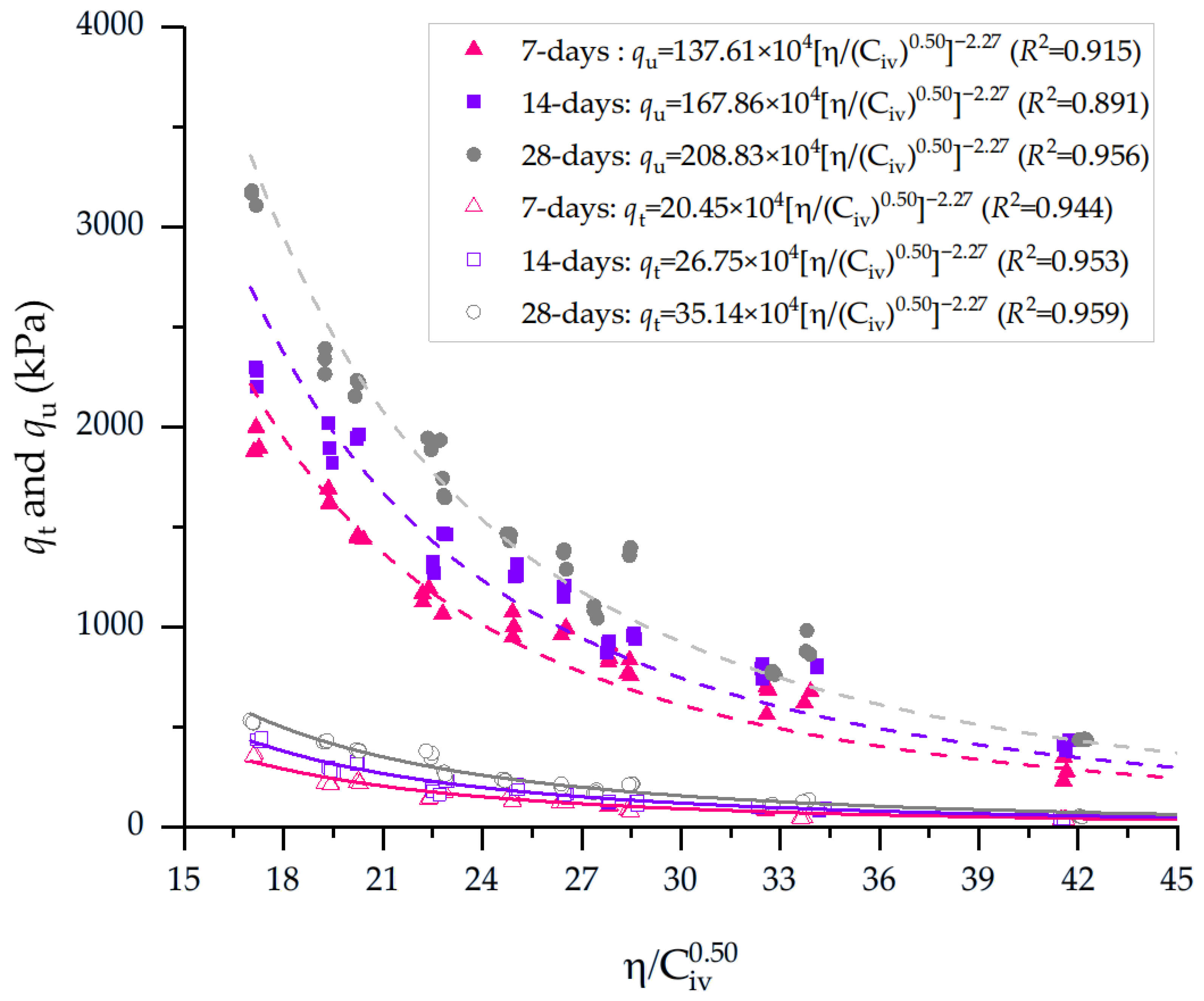 - Mechanical strength increased markedly with decreasing η/Civ, demonstrating the dominant influence of porosity reduction over cement volume fraction. For , mixtures with η/Civ = 45–46 exhibited very low strengths (60–80 kPa), whereas reducing η/Civ to 19–21 yielded between 1500 and 3000 kPa, representing 15–25-fold increases. For , the same trend was observed: at η/Civ = 46, remained below 15 kPa, while values of 22–23 produced between 130 and 330 kPa, and η/Civ = 19 yielded peak strengths above 400 kPa, confirming a consistent strengthening mechanism for both tensile and compressive responses.