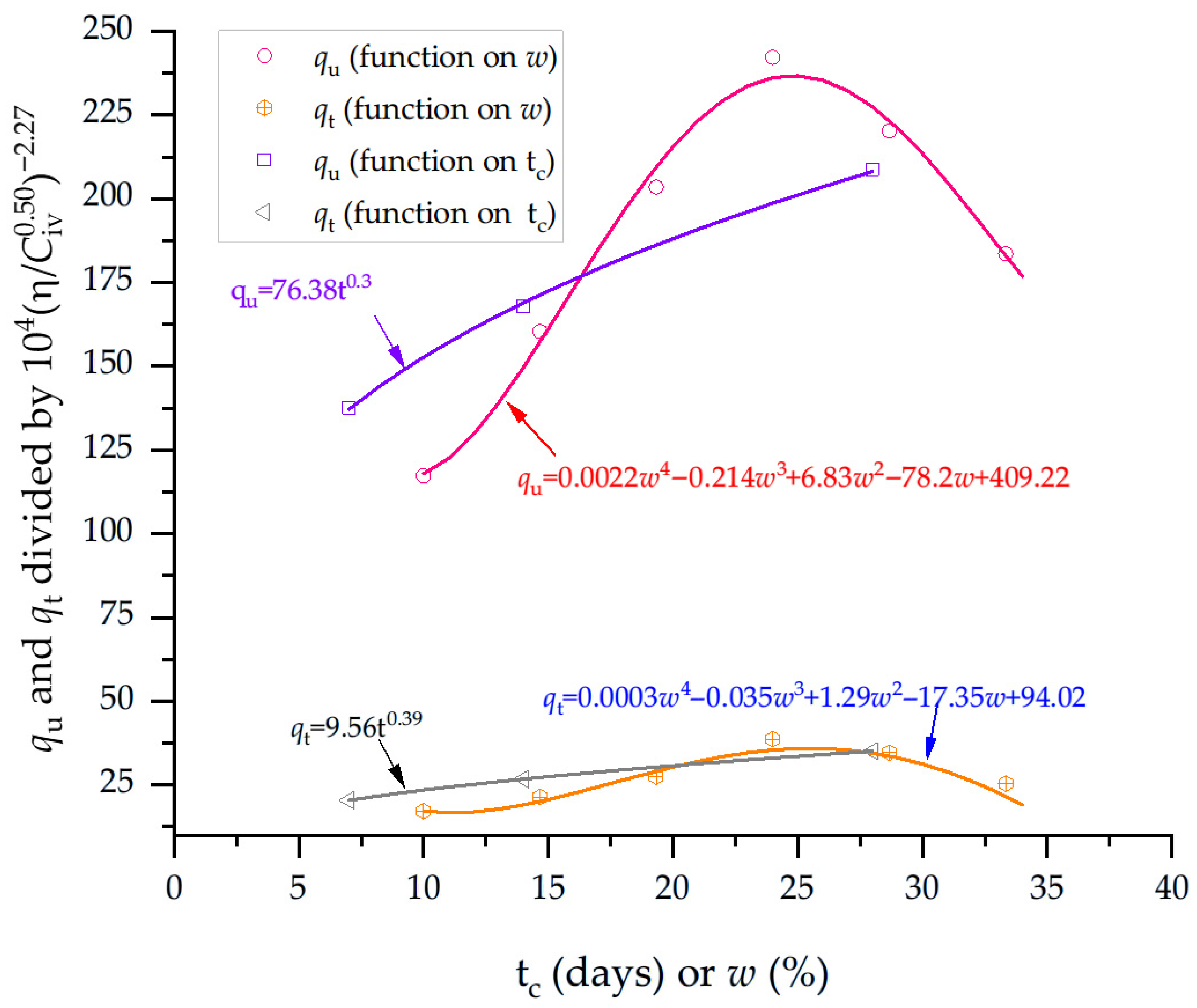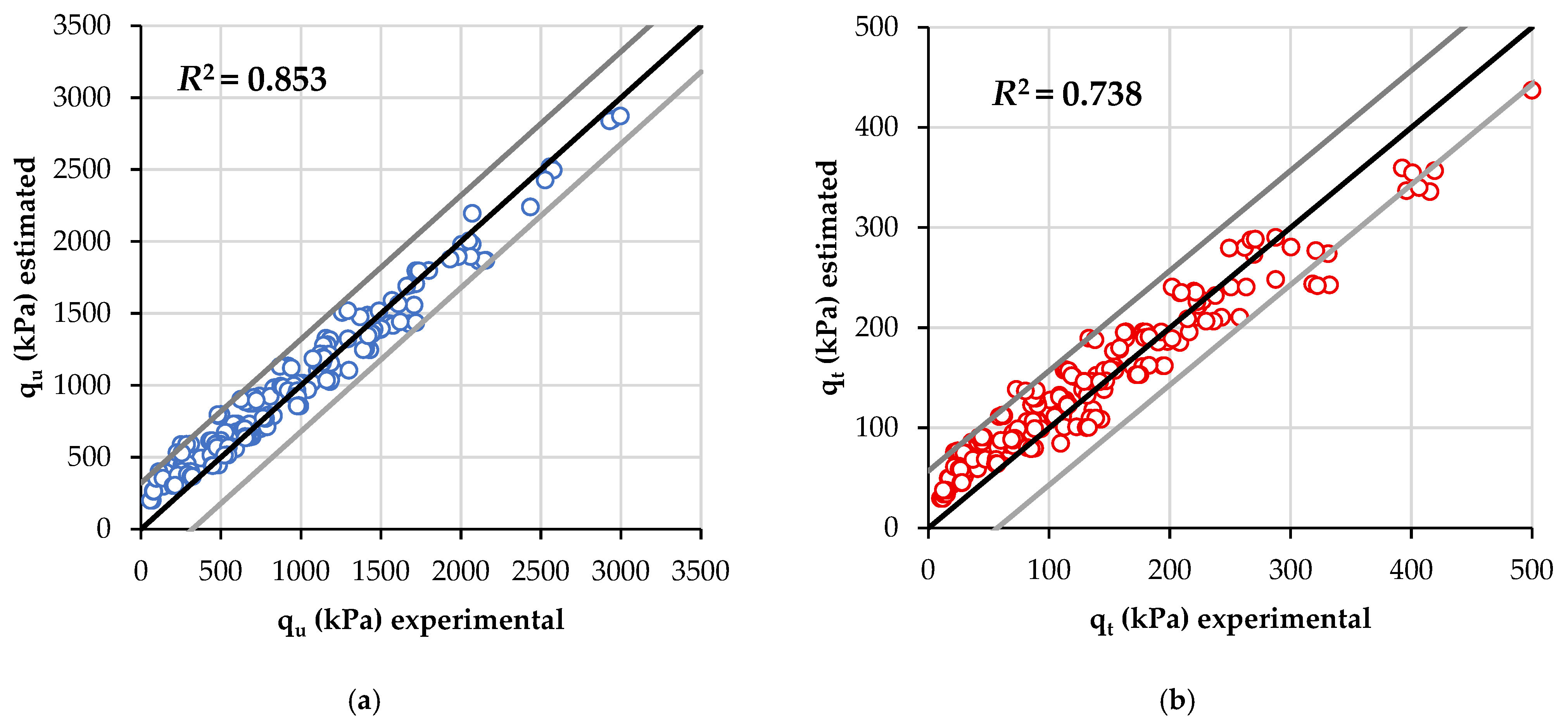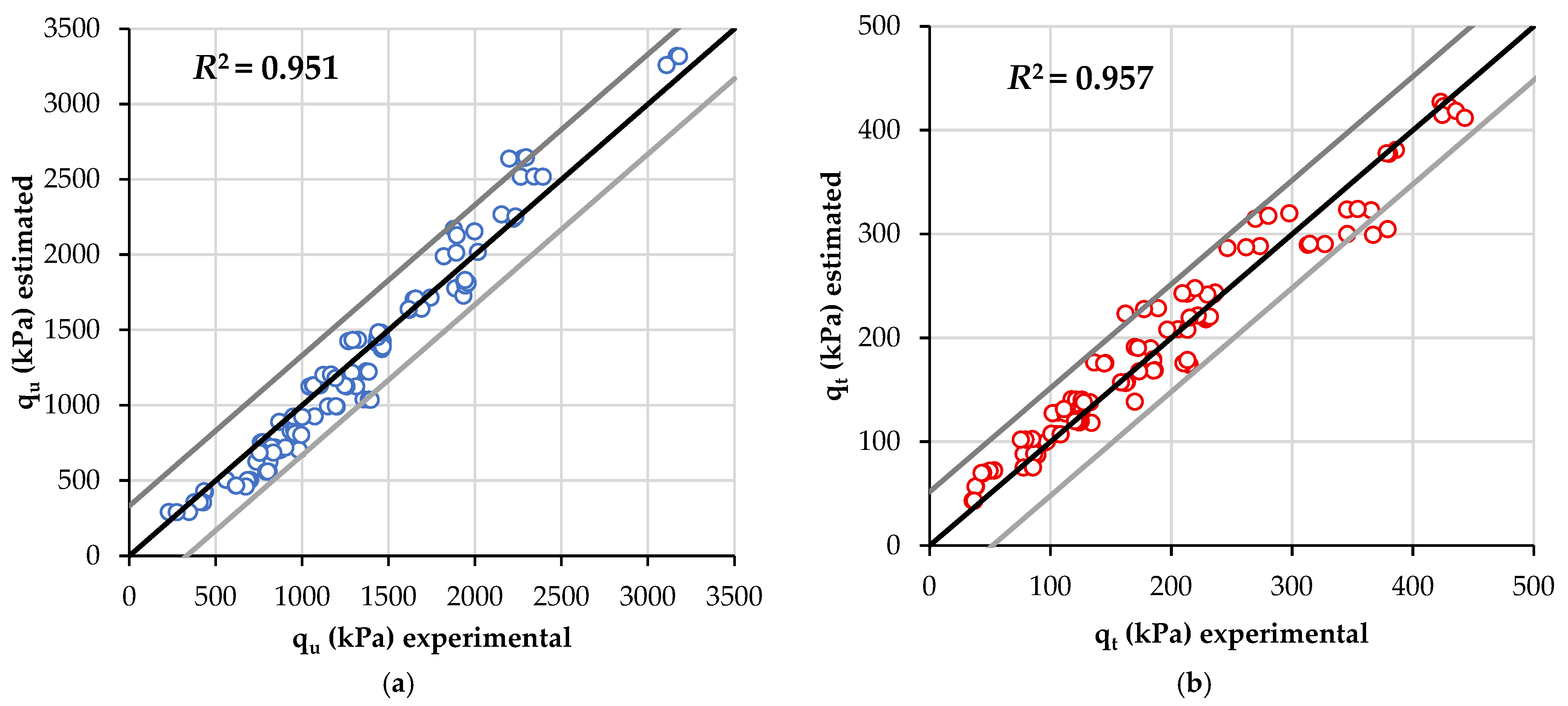 4.3. Normalization Equations for Estimating the Unconfined Compressive and Splitting Tensile Strength