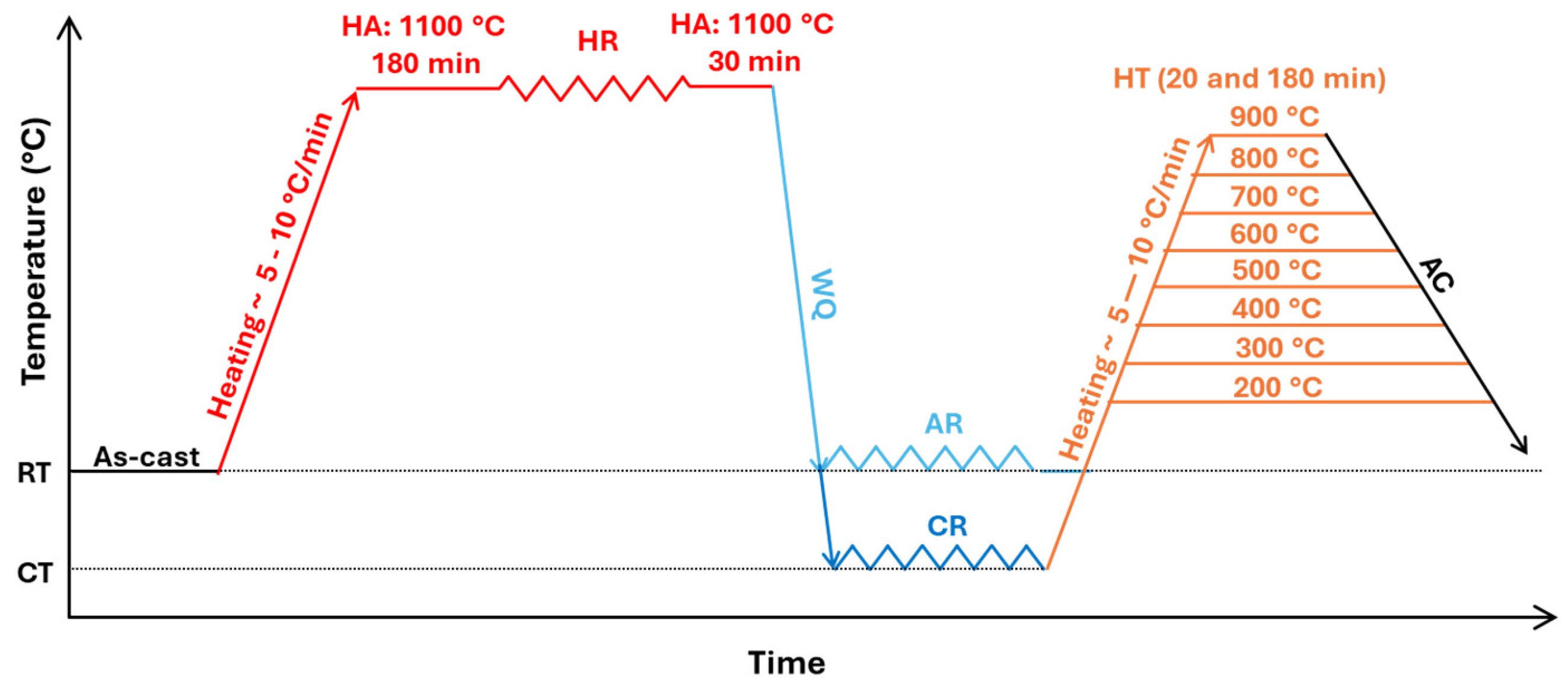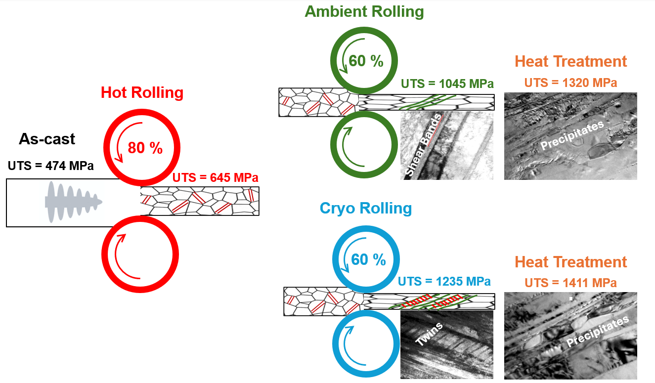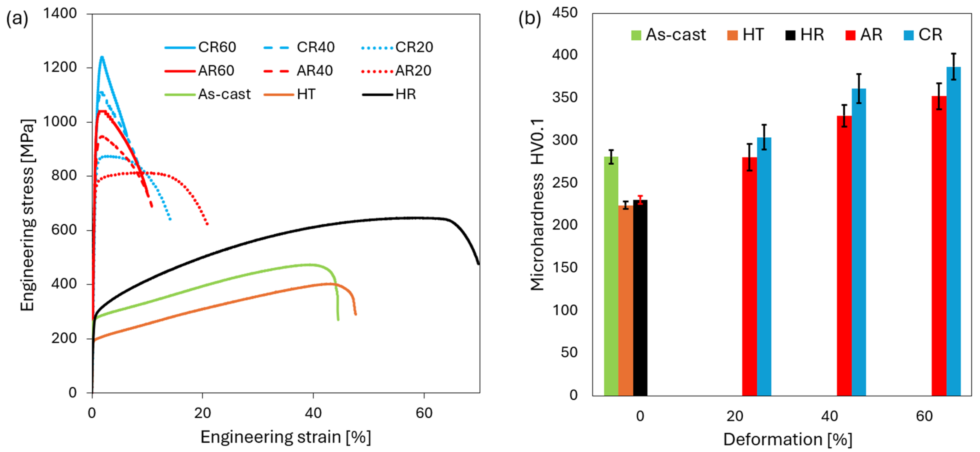 - Overall, the investigated alloy offers a wide spectrum of tunable mechanical properties, which can be effectively tailored through appropriate combinations of thermomechanical processing routes, including rolling temperature, deformation degree, and subsequent heat treatment.