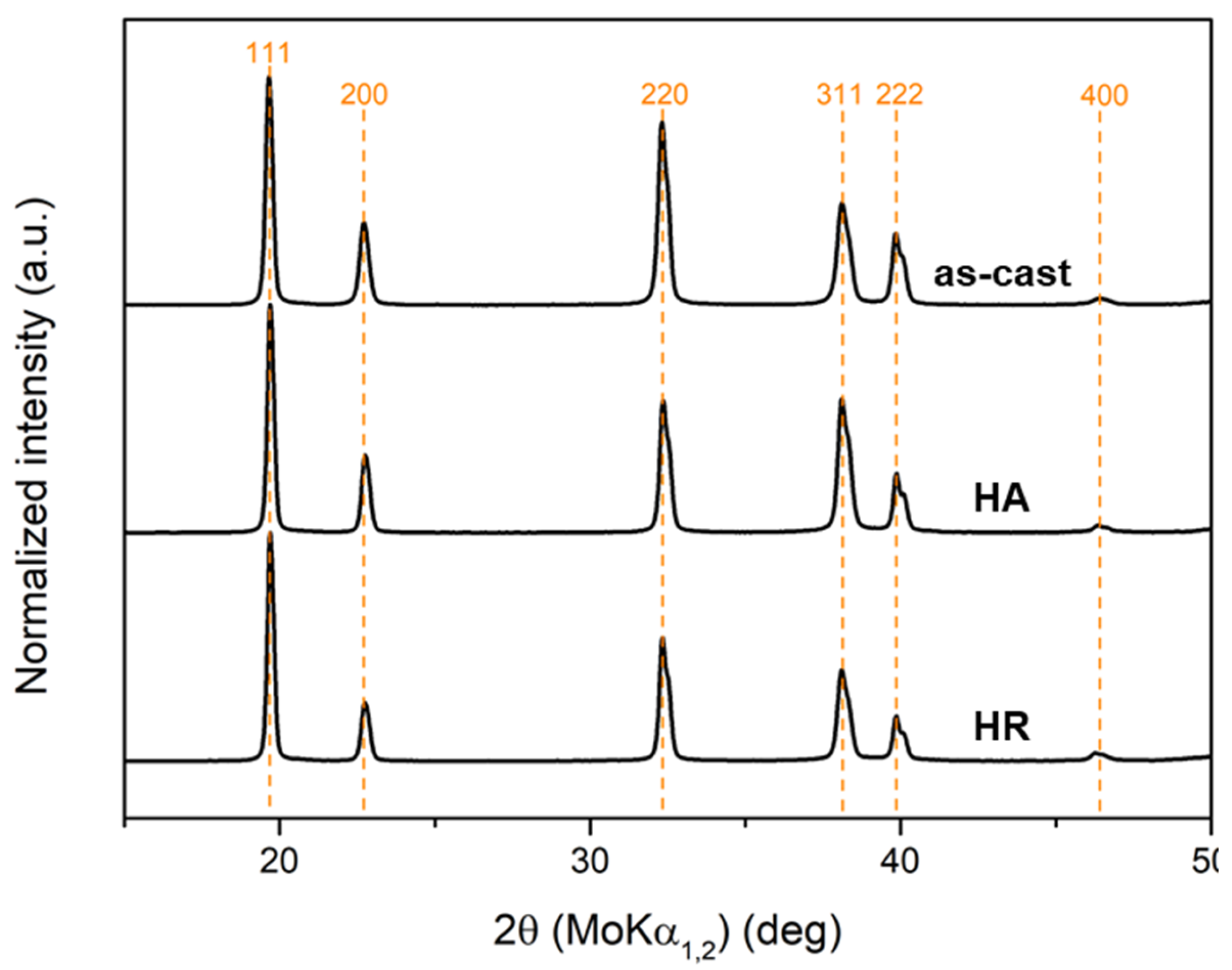 - The homogenization of the as-cast microstructure of the investigated MEA alloy through homogenization annealing followed by 80% hot rolling resulted in a chemically homogeneous, fine-grained polyhedral FCC microstructure with an increased fraction of annealing twins and a single-phase supersaturated solid solution, leading to a more stable plastic flow behavior of the material.