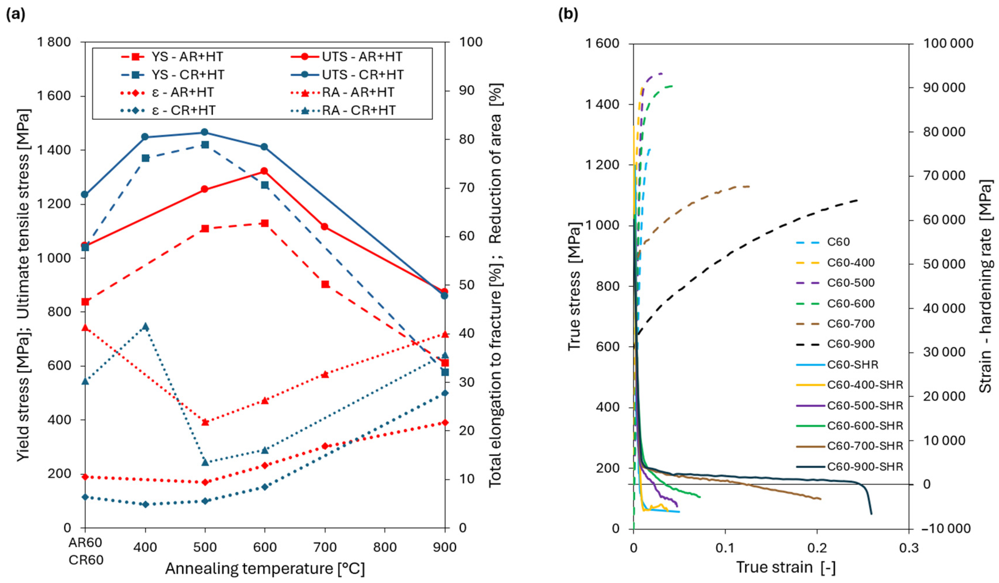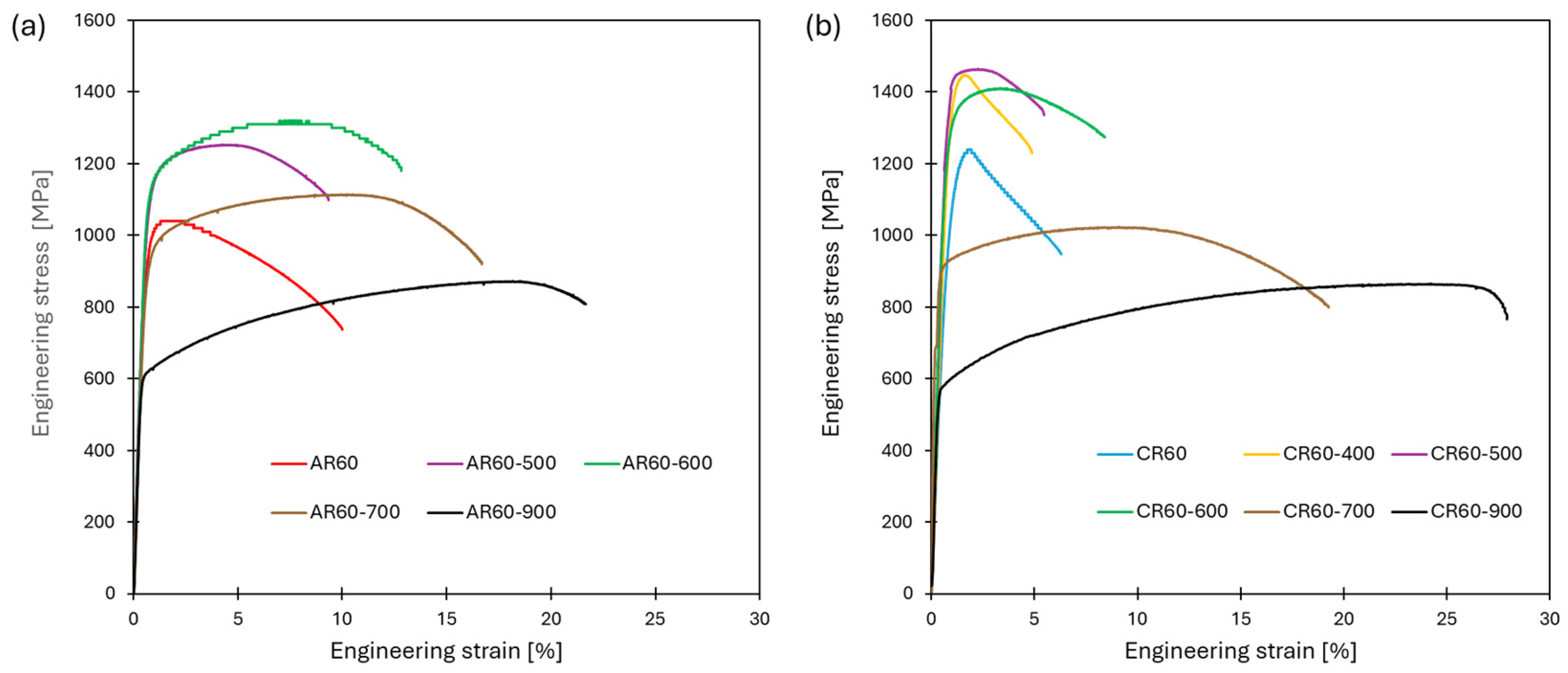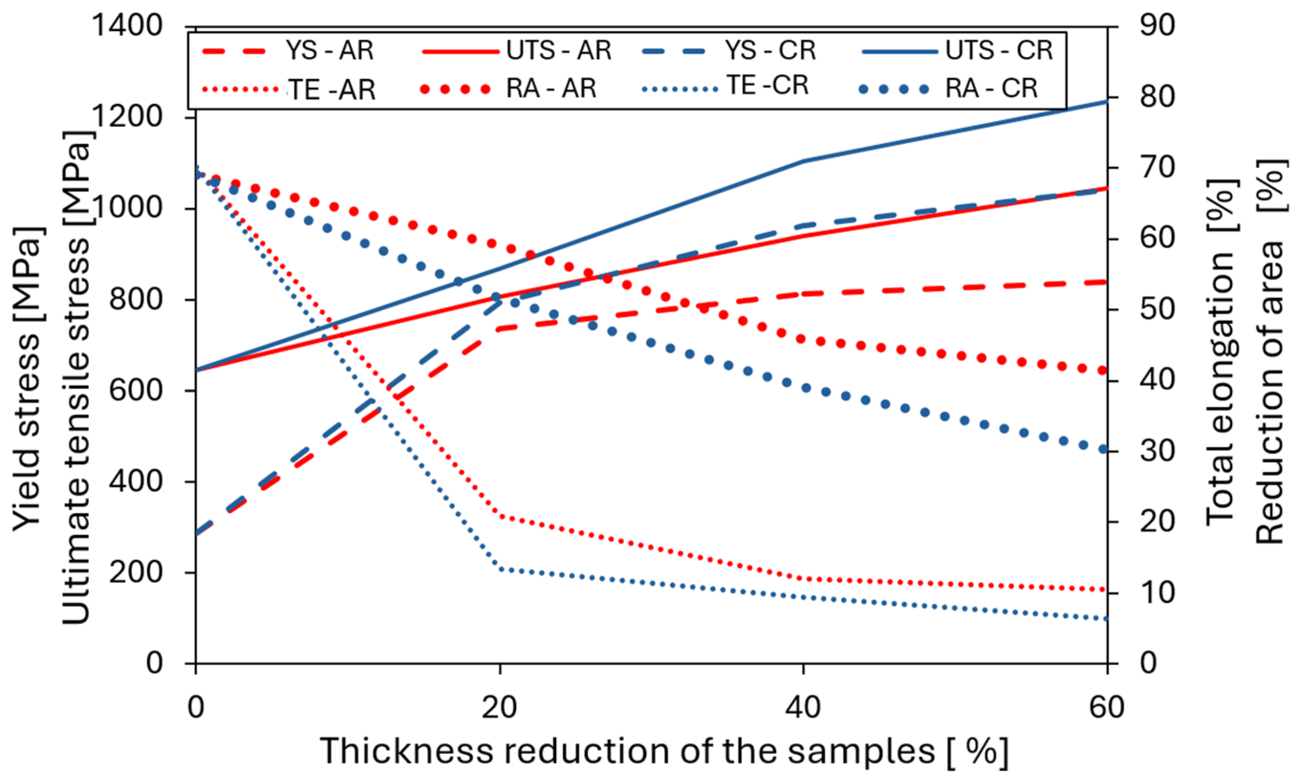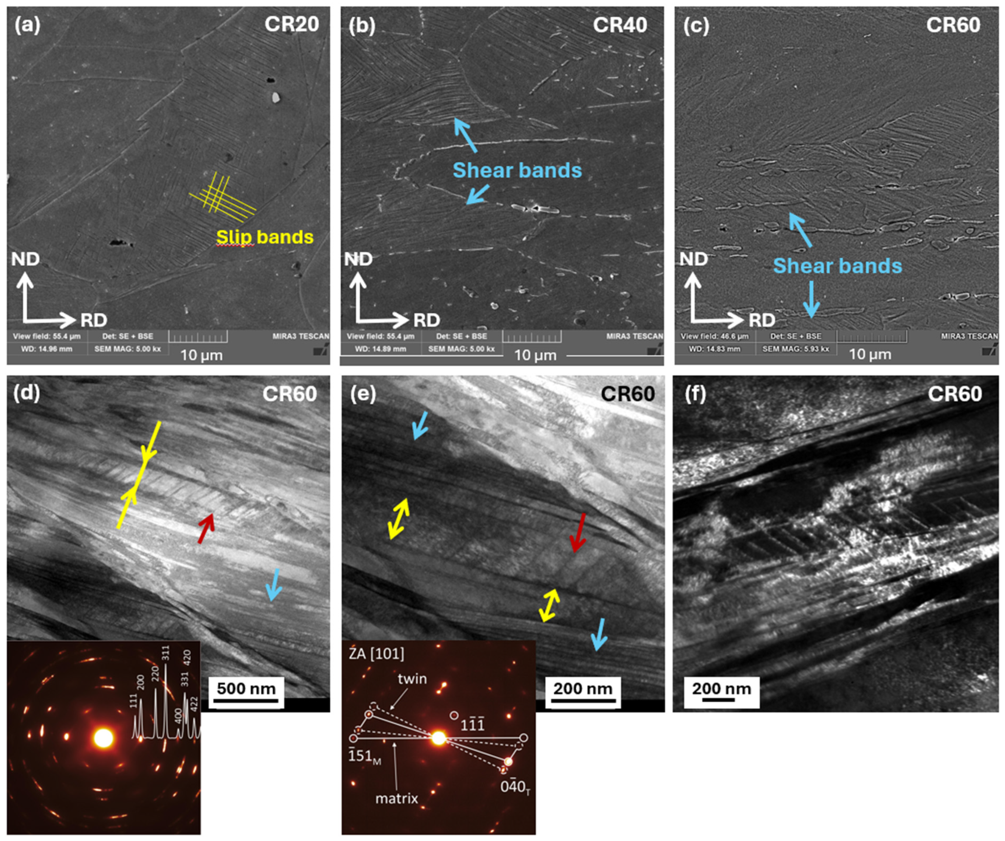 - The microstructural evolution during rolling under both temperature conditions (AR and CR) was predominantly governed by shear band formation; however, under cryogenic conditions (CR), a more pronounced deformation localization was observed, leading to the formation of deformation nanotwins and significantly enhanced strengthening. As a result, the CR60 condition achieved a yield strength of 1040 MPa and an ultimate tensile strength of 1235 MPa compared to 838 MPa (YS) and 1045 MPa (UTS) for the AR60 condition.