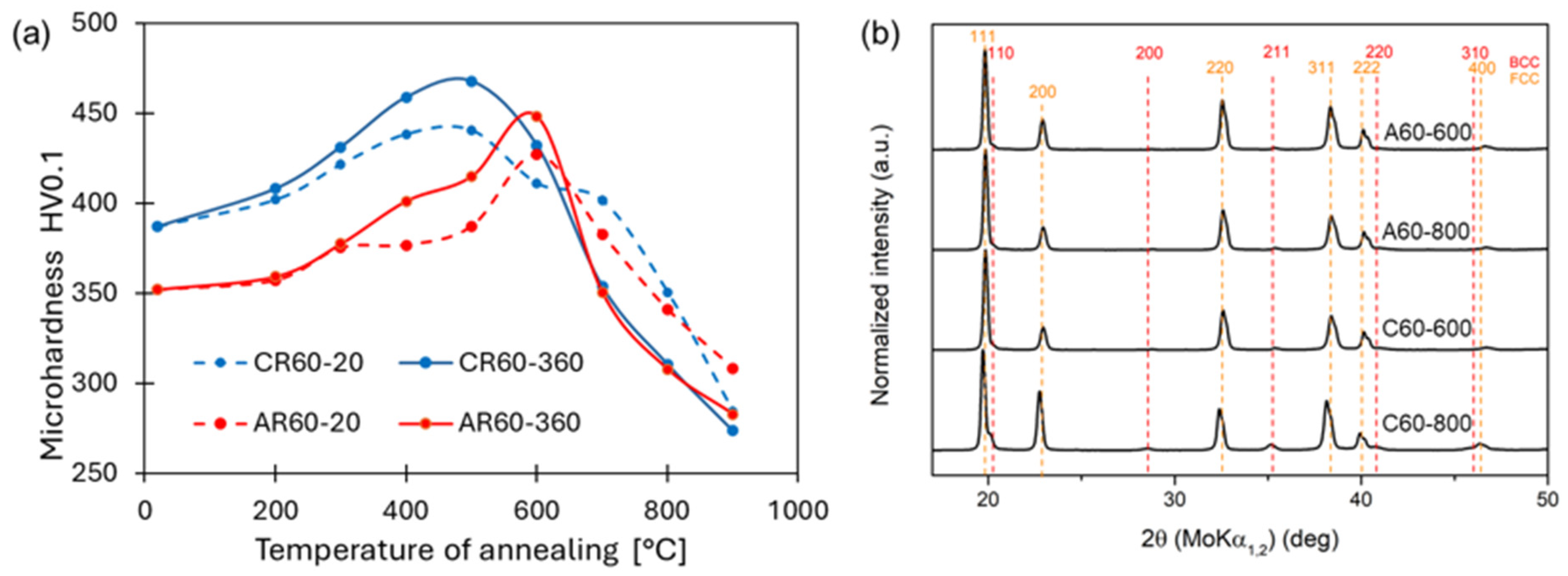 - Mahata, C.; Kumar, K.N.; Bruder, E.; Gowtam, D.; Sadhasivam, M.; Durst, K.; Pradeep, K.G. Recovery of Metastable Solid Solution from a Severe Plastically Deformed Cu Alloyed FeMnCoCr High Entropy Alloy. J. Alloys Metall. Syst. 2025, 11, 100200. [Google Scholar] [CrossRef]