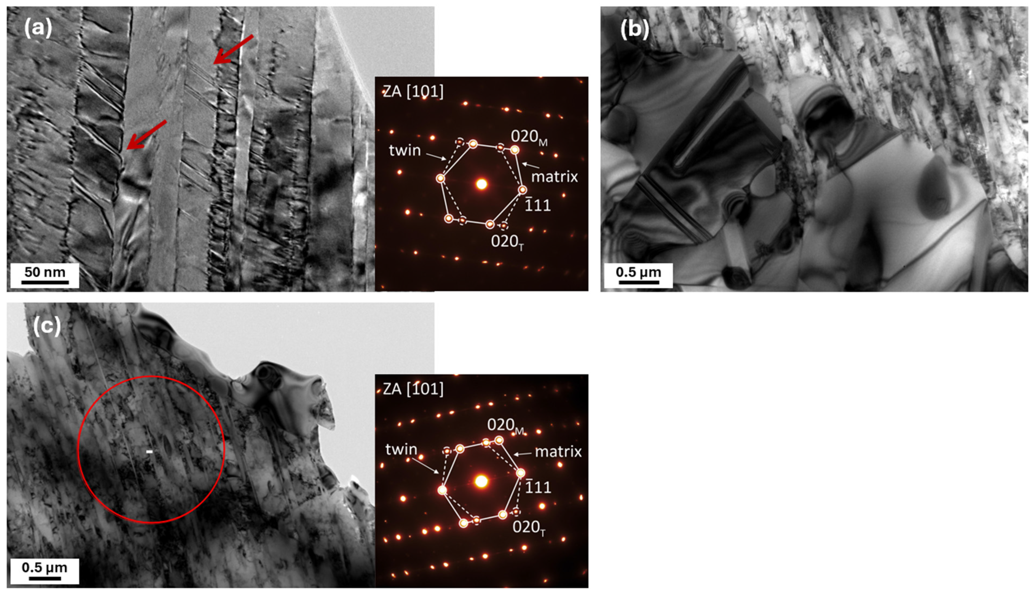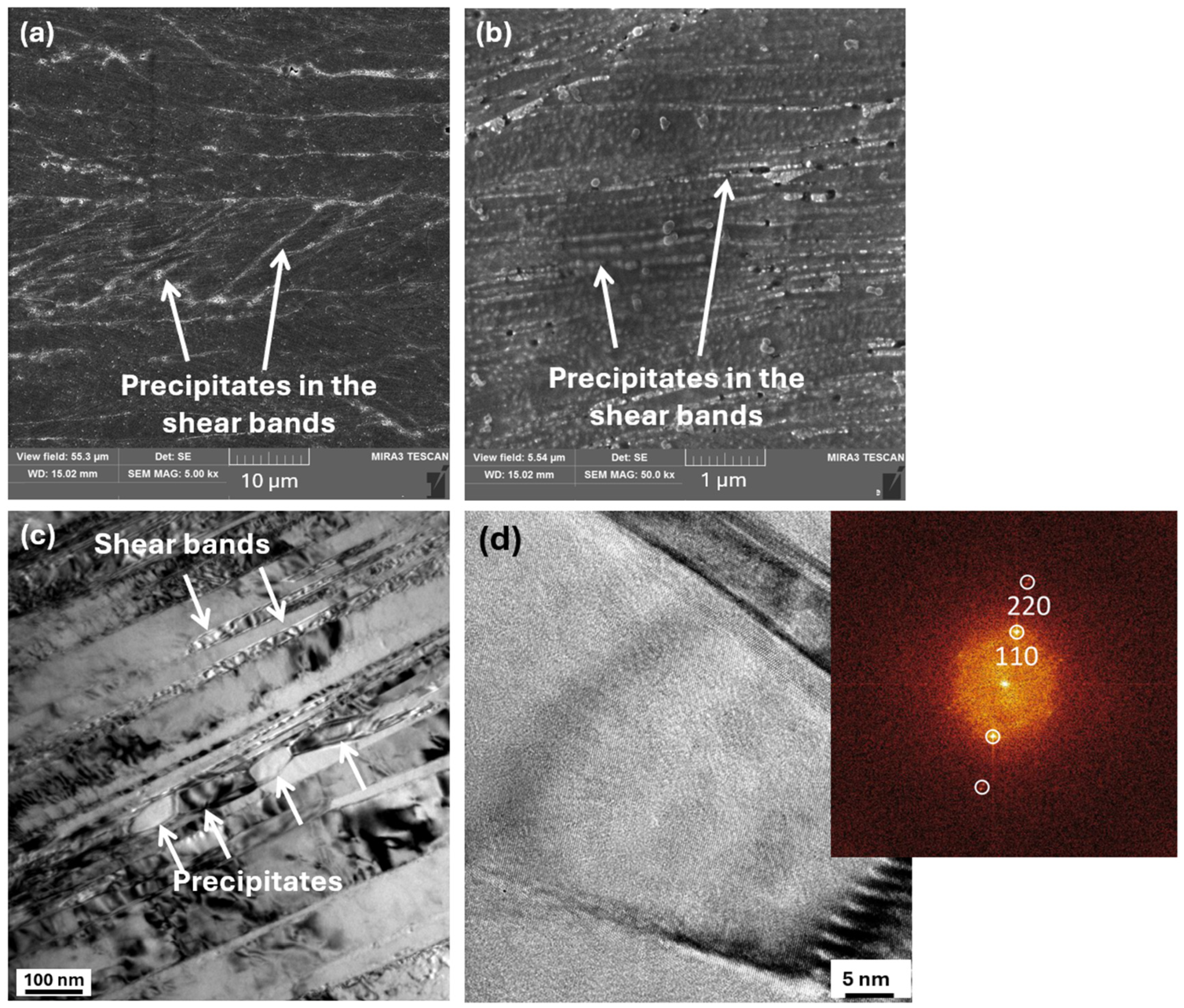 - Precipitation hardening of the alloy was achieved through the formation of B2 precipitates arranged in chain-like configurations along the shear bands, which significantly contributed to the enhancement of strength. The alloy processed under cryogenic conditions reached its maximum strengthening after annealing at 500 °C, exhibiting a yield strength of 1420 MPa and an ultimate tensile strength of 1465 MPa; this effect results from the synergistic contribution of a higher fraction of B2 precipitates and the presence of deformation nanotwins.