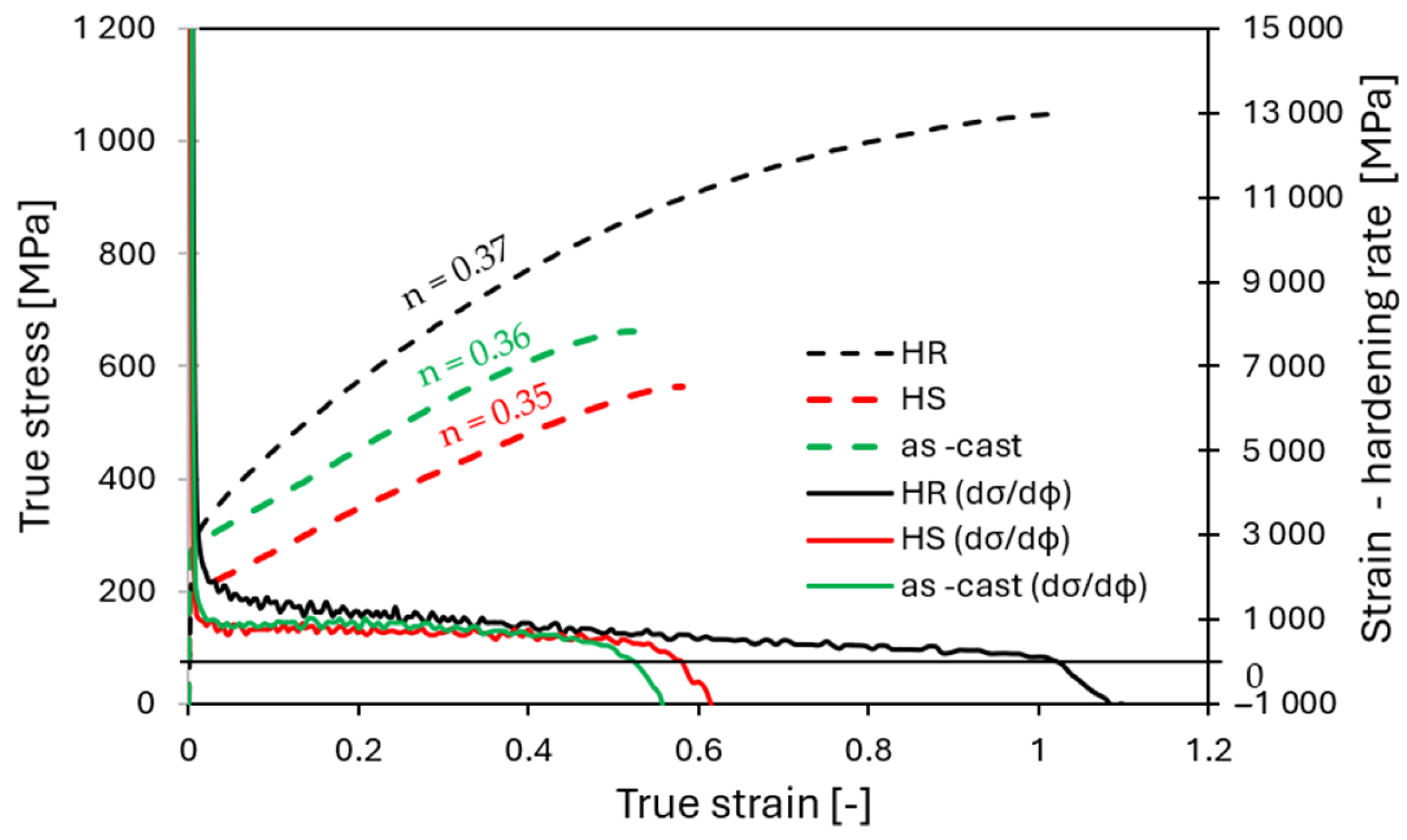3.2. Mechanical Properties After Homogenization of the As-Cast State and After Alloy Strengthening by Rolling Under Ambient and Cryogenic Conditions