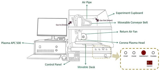 The surfaces of jute fabrics were treated using the APP system (Corona Plasma System, model APC500; Diener Electronic GmbH + Co., KG, Ebhausen, Germany). This system employs a low-frequency generator operating at 40 kHz with a power output of 500 W to sustain the plasma within the reactor (Figure 1). The APP treatment was performed inside an enclosed, air-circulated chamber equipped with a movable conveyor belt and desk. Figure 2 shows the configuration of the APP system. The plasma nozzle head delivered a glow discharge onto the surfaces of the jute fabrics along the X and Y axes at a speed of 8.5 cm/s. Adjustable nozzle-to-fabric distances along the Z axis were set to 2.5 cm and 3.5 cm to allow a comparison of treatment outcomes. Three types of gases—dry air, argon (Ar), and nitrogen (N2)—were used separately as plasma sources during the APP treatments. Each gas was introduced into the chamber at a specified flow rate for 10 min, maintaining a pressure differential of 0.2–0.4 mbar. A summary of the sample identifiers and associated plasma treatment conditions is provided in Table 1.