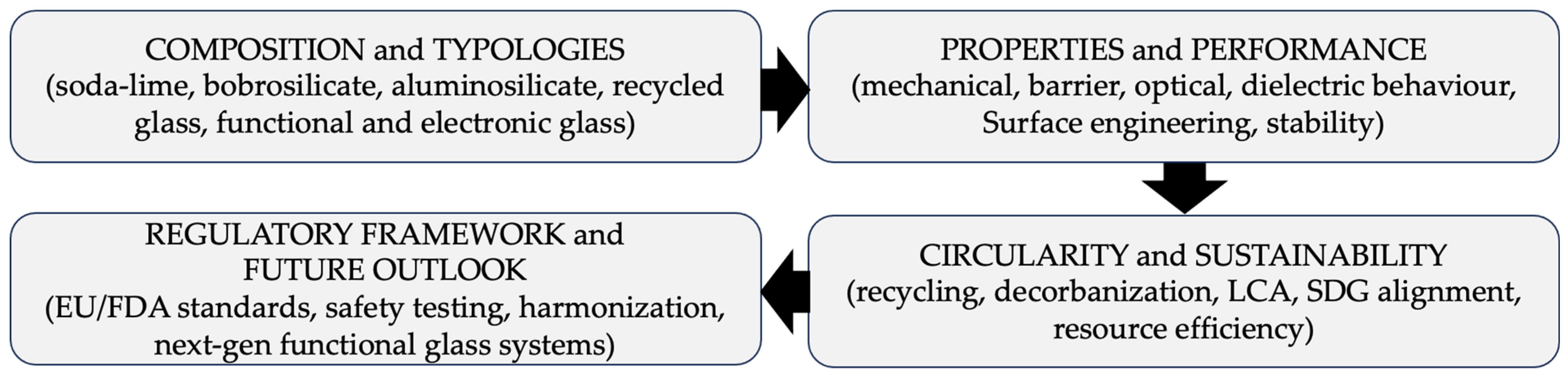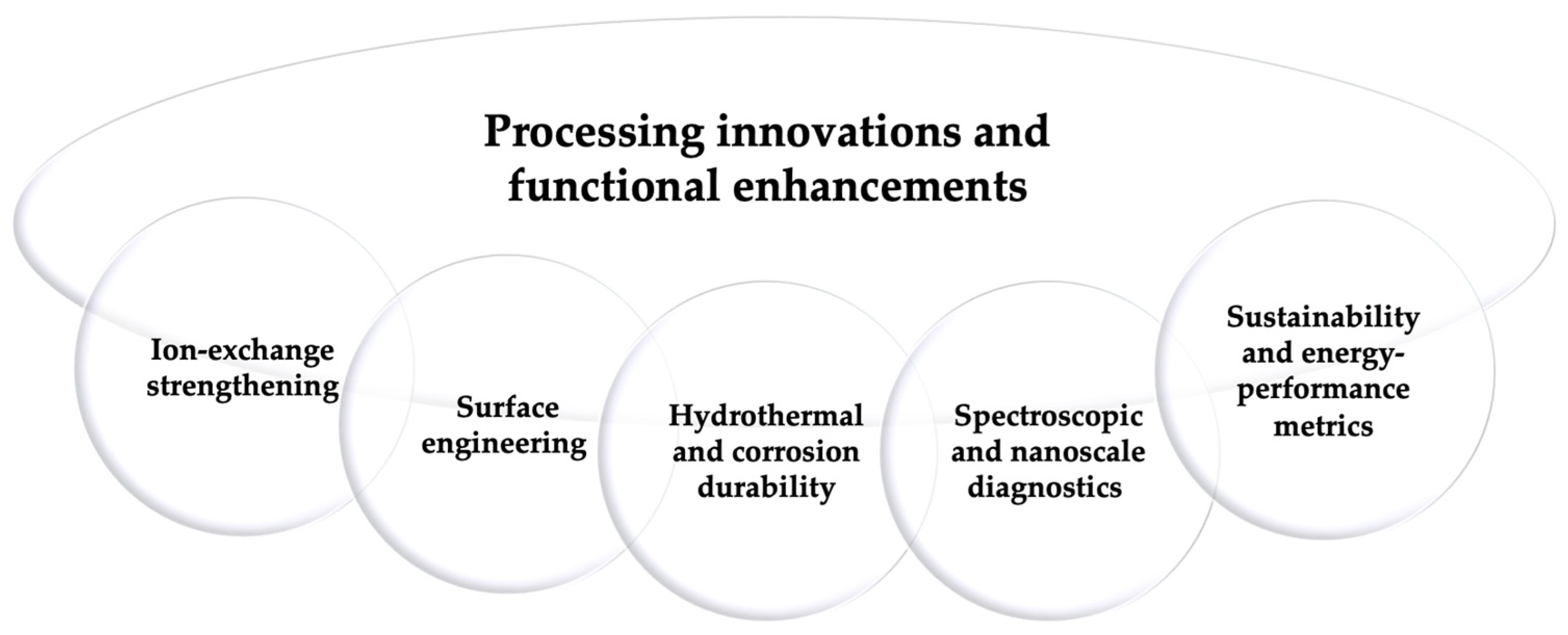 - Correlation between glass composition, processing routes, and functional performance.