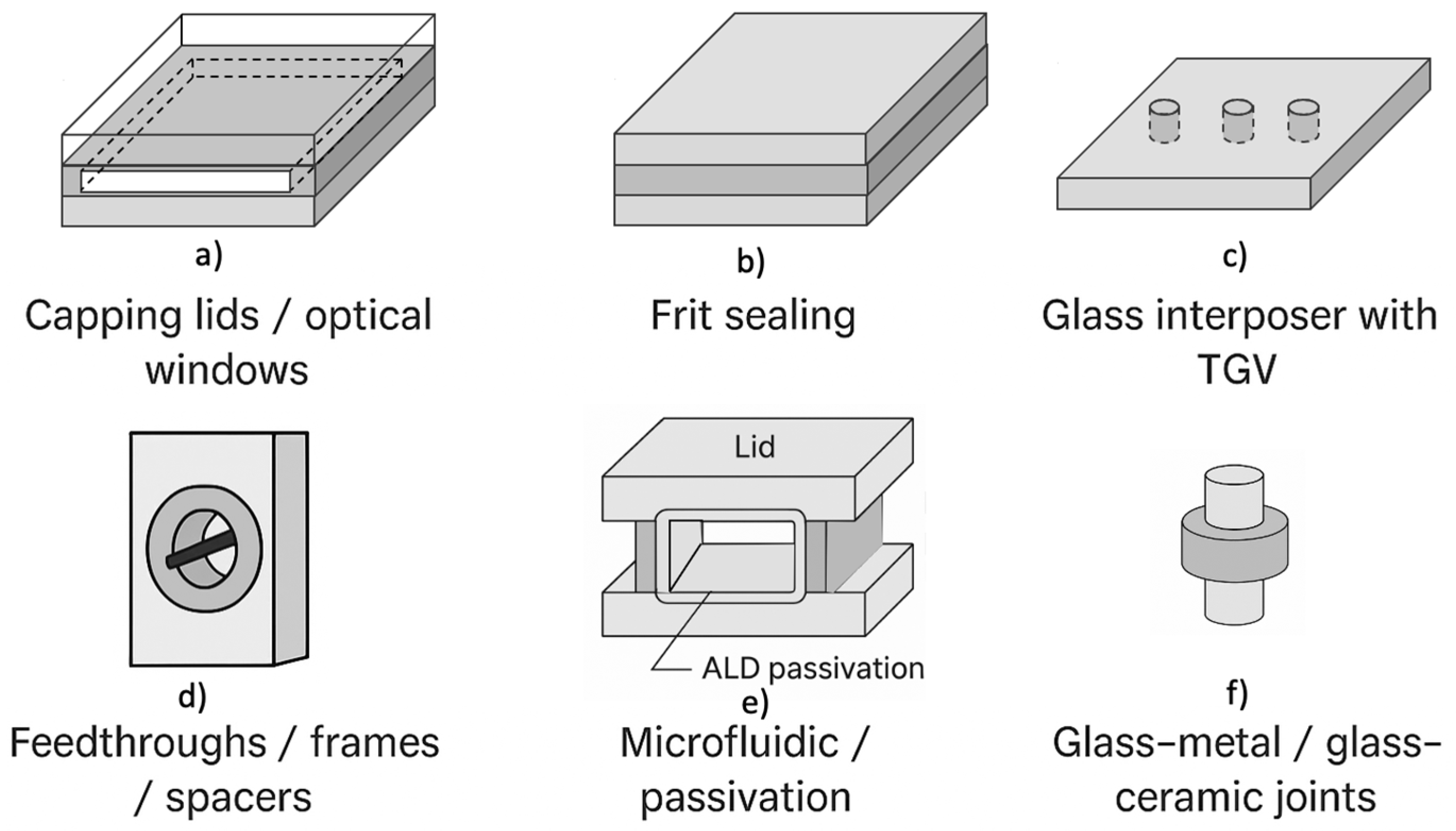 | Feedthroughs/ frames/spacers | Mechanical alignment, electrical feedthrough, cavity definition | Borosilicate, aluminosilicate, glass–ceramic rings; diffusion or glass-to-metal bonding |