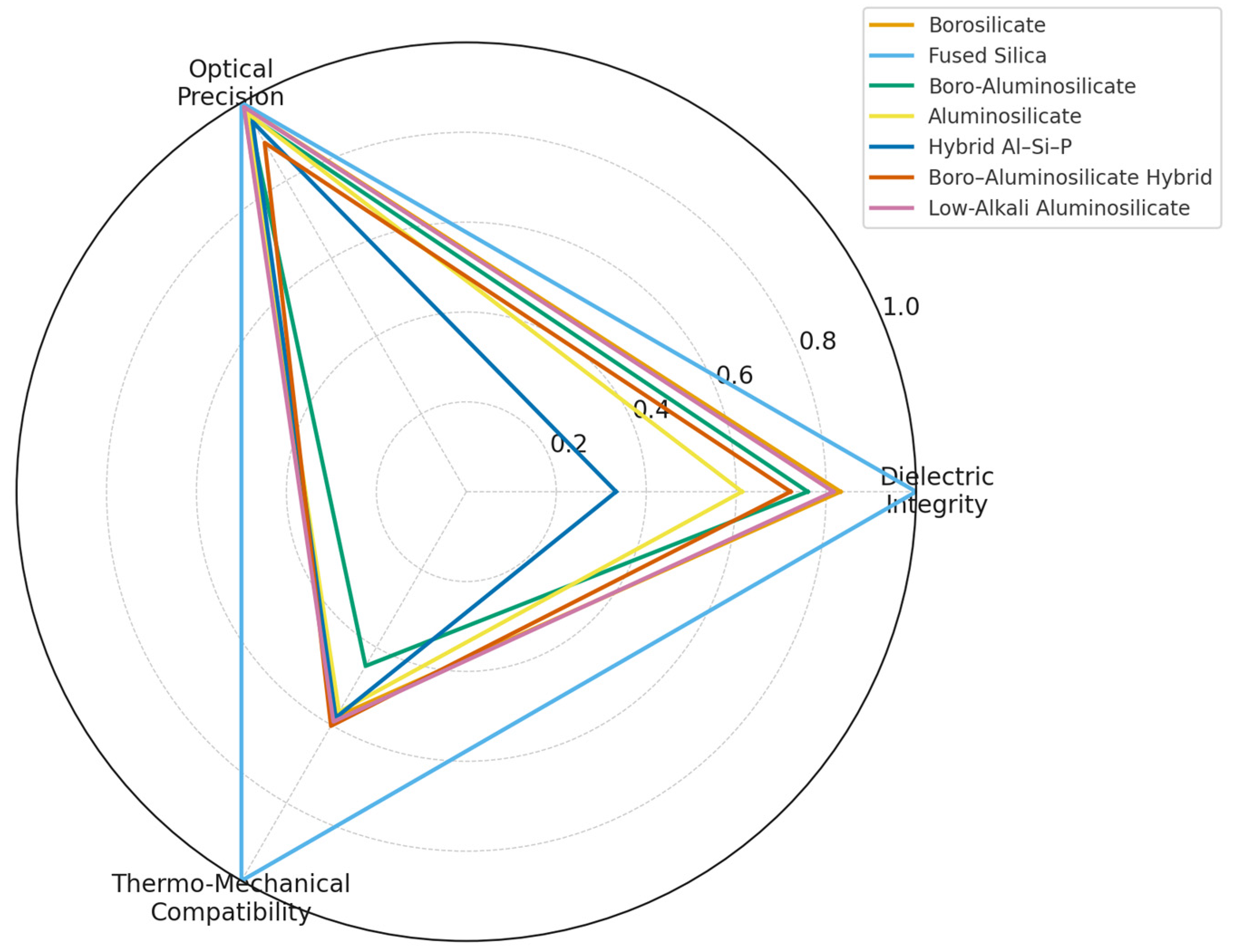 - Alkali-free borosilicate—Compositions with high silica and negligible alkali oxides, replaced by alkaline-earth modifiers to suppress ionic mobility. Their low permittivity and loss tangent enable hermetic and dielectric packaging in microelectronics, RF systems, and optoelectronic devices, including substrates, optical windows, cover glasses, and interposers [46,48].