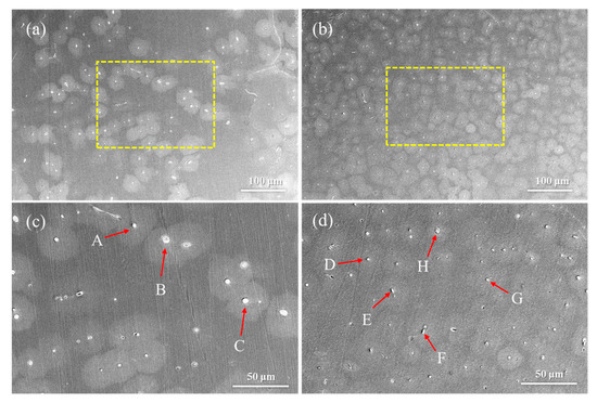 SEM images of homogenized Mg-0.4Al-0.3Ca-0.2Mn-xSn alloys (x = 0, 0.1 wt.%) at different magnifications: (a,c) x = 0; (b,d) x = 0.1.