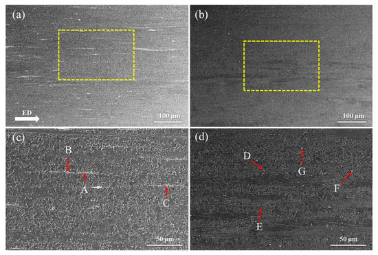 Microstructures of Mg-0.4Al-0.3Ca-0.2Mn-xSn alloys (x = 0, 0.1 wt.%) after extrusion at different magnifications: (a,c) x = 0; (b,d) x = 0.1.