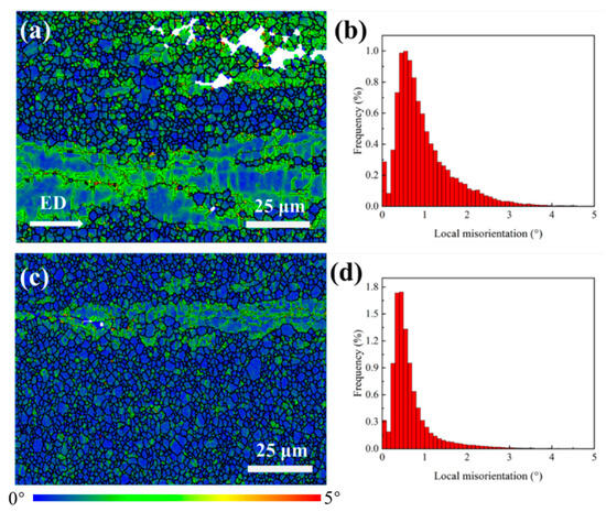 KAM maps and corresponding local misorientation angle distributions of extruded Mg-0.4Al-0.3Ca-0.2Mn-xSn alloys (x = 0, 0.1 wt.%): (a,b) x = 0; (c,d) x = 0.1.