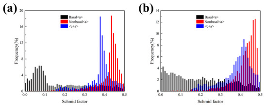 Frequency histograms of SF for basal <a>, non-basal <a>, and <c+a> slip systems in extruded Mg-0.4Al-0.3Ca-0.2Mn-xSn alloys (x = 0, 0.1 wt.%): (a) x = 0; (b) x = 0.1.