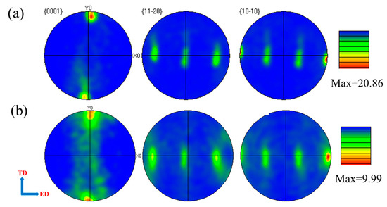 The macro-texture evolution of the extruded Mg-0.4Al-0.3Ca-0.2Mn-xSn alloys was further characterized using pole figures, as illustrated in Figure 10. Both alloys exhibit a typical basal fiber texture, where the {0001} basal poles are primarily distributed perpendicular to the ED. For the Sn-free alloy (Figure 10a), a high maximum texture intensity of 20.86 is observed, indicating a strong alignment of the basal planes parallel to the ED in the coarse un-DRXed regions. This strong texture coincides with the low SF values and high KAM previously discussed, suggesting significant plastic anisotropy and dislocation accumulation.
