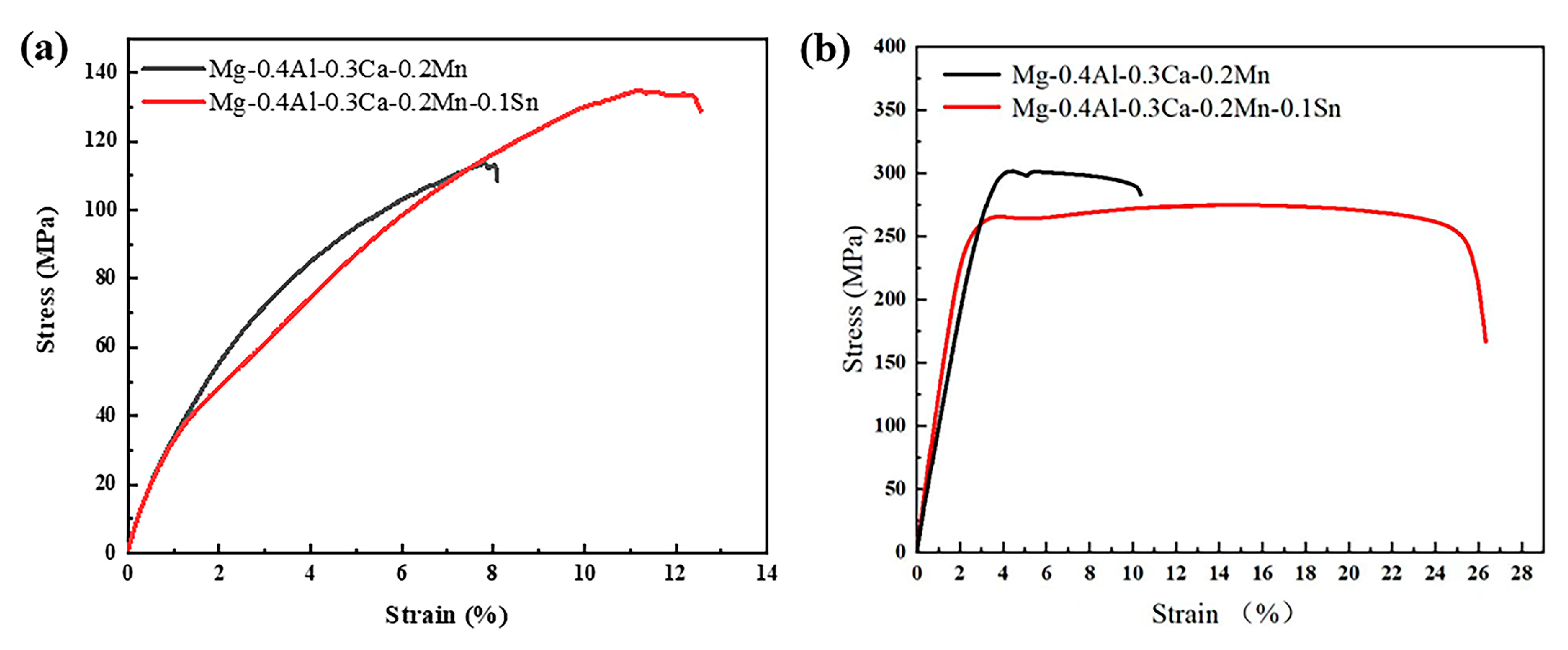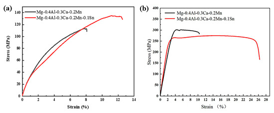 Stress–strain curve of homogenized and extruded Mg-0.4Al-0.3Ca-0.2Mn-xSn alloys (x = 0, 0.1 wt.%): (a) homogenized; (b) extruded.