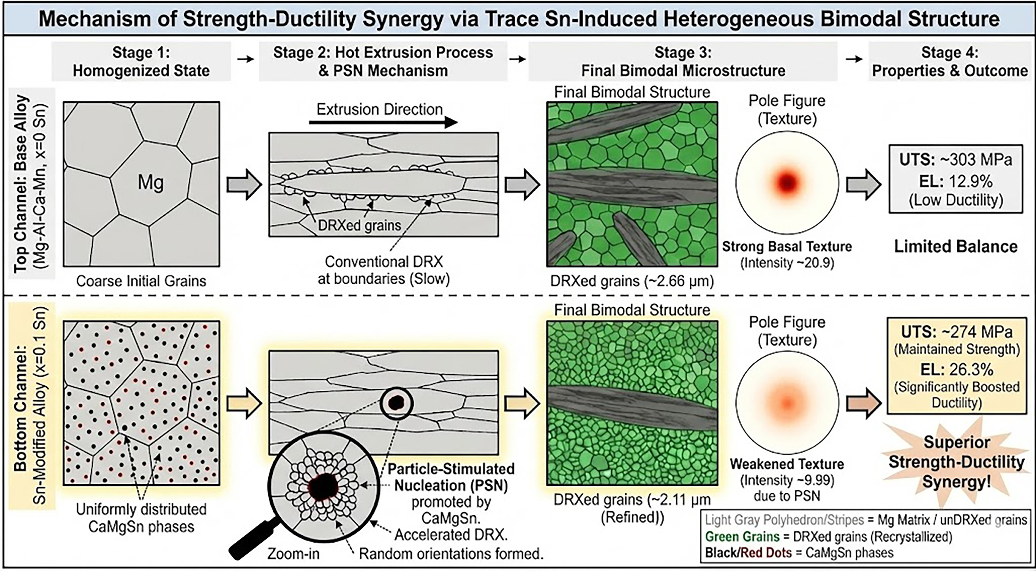 In this study, a dilute Mg-0.4Al-0.3Ca-0.2Mn-xSn alloy (x = 0, 0.1 wt.%) was designed and fabricated via hot extrusion at a relatively low temperature of 320 °C. We systematically investigated the influence of trace Sn on the evolution of second-phase particles, DRX behavior, and texture modification. Specifically, the role of Sn-containing phases in stimulating recrystallization via the PSN mechanism and the resulting heterogeneous bimodal structure were analyzed. This work aims to provide a fundamental understanding of how trace Sn microalloying facilitates an exceptional strength-ductility balance, offering a new pathway for the design of high-performance RE-free Mg alloys.