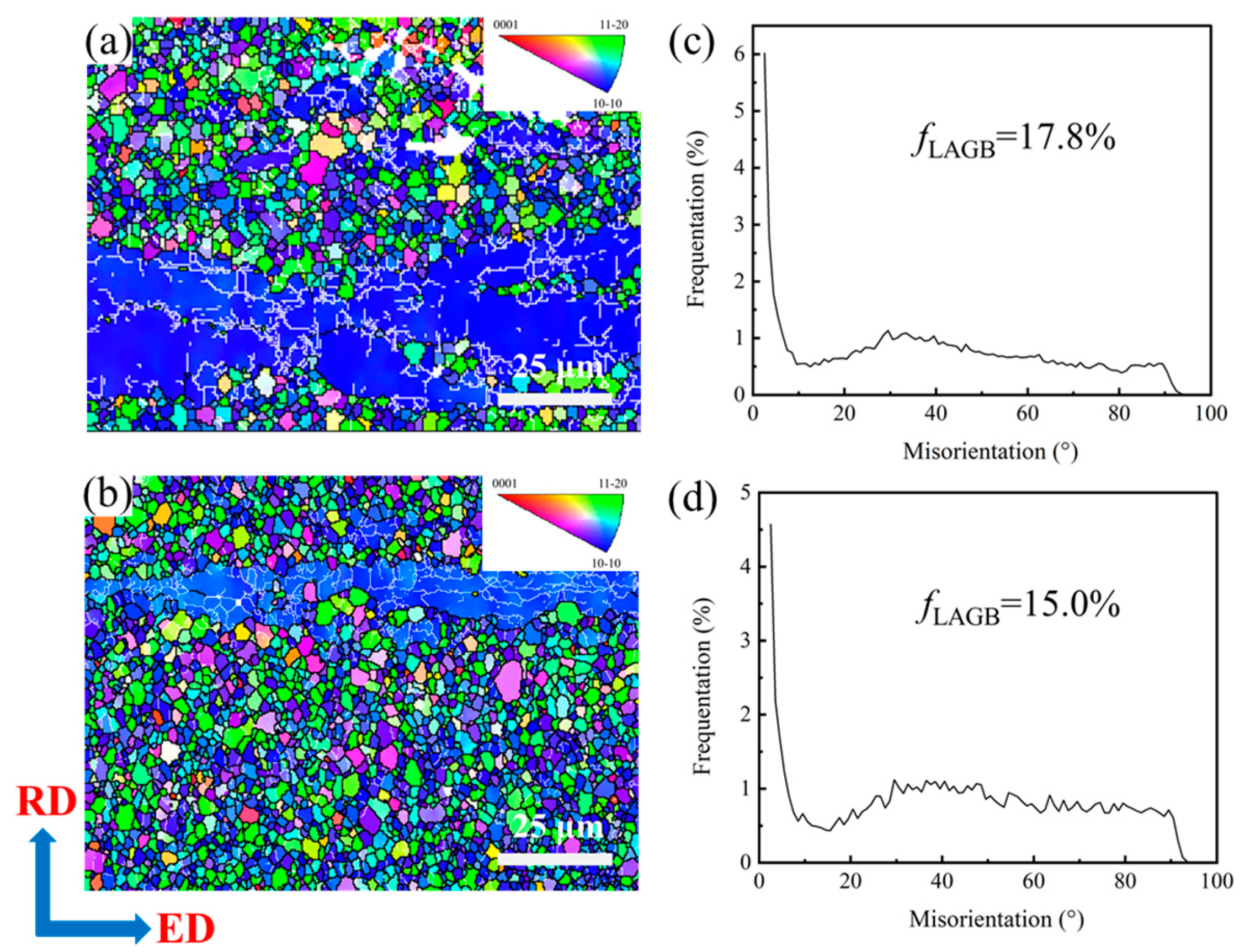 Figure 6c,d illustrate the misorientation angle distributions of the extruded Mg-0.3Al-0.4Ca-0.2Mn-xSn (x = 0, 0.1) alloys. The fractions of low-angle grain boundaries (LAGBs) within the selected regions (corresponding to 2° ≤ θ ≤ 15°) are 17.8% and 15% for the alloys with x = 0 and x = 0.1, respectively. These results suggest that both alloys contain a high fraction of LAGBs, with the former exhibiting a marginally higher proportion primarily attributed to its greater content of unDRXed grains. Consistent with the IPF maps, a high density of LAGBs is concentrated within the unDRXed grains. Generally, a higher fraction of LAGBs correlates with an elevated dislocation density, which in turn enhances the strength and hardness of the alloy while reducing its plasticity and toughness.