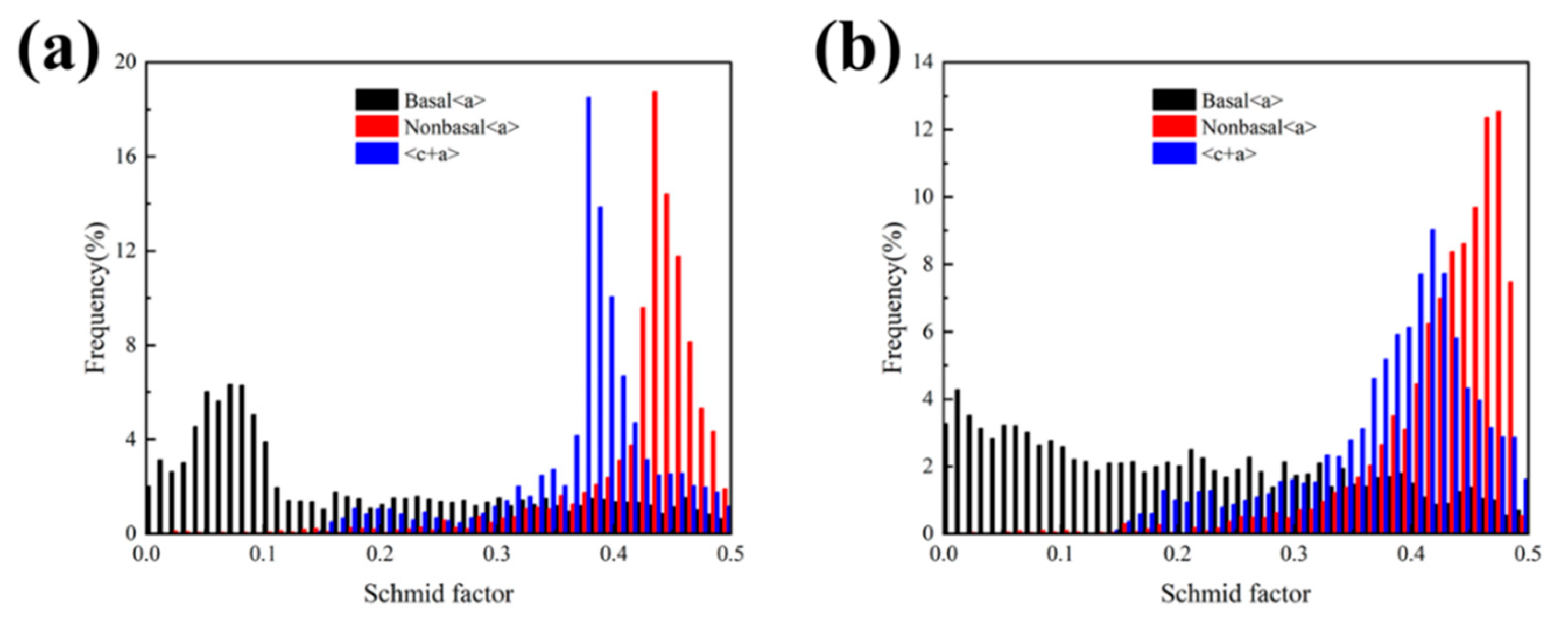 To quantitatively evaluate the ease of slip activation, Figure 9 presents the frequency histograms of SF for the basal <a>, non-basal <a>, and <c+a> slip systems. For the Sn-free alloy (Figure 9a), the SF for basal slip exhibits a pronounced bimodal distribution with a significant peak at low values (<0.1). This confirms that a large fraction of grains, particularly the coarse un-DRXed grains identified in Figure 8a, are in a “hard orientation” where the basal planes are nearly parallel to the ED. Such a configuration significantly restricts the activity of the primary basal slip system, leading to high yield strength but limited ductility. In contrast, the addition of 0.1 wt.% Sn (Figure 9b) results in a notable shift in the SF distribution toward higher values for all slip systems. The peak for basal slip at low SF values is substantially suppressed and redistributed toward the range of 0.2–0.5. Simultaneously, the frequency of high SF values (>0.4) for non-basal <a> and <c+a> slip systems increases markedly. This shift is directly correlated with the texture weakening induced by the higher degree of dynamic recrystallization (DRX) seen in Figure 8b. The increased average SF for both basal and non-basal slips implies that a lower external stress is required to reach the CRSS for multiple slip systems. Consequently, the 0.1Sn alloy promotes more homogeneous plastic deformation and enhanced ductility by facilitating the simultaneous activation of various slip modes.