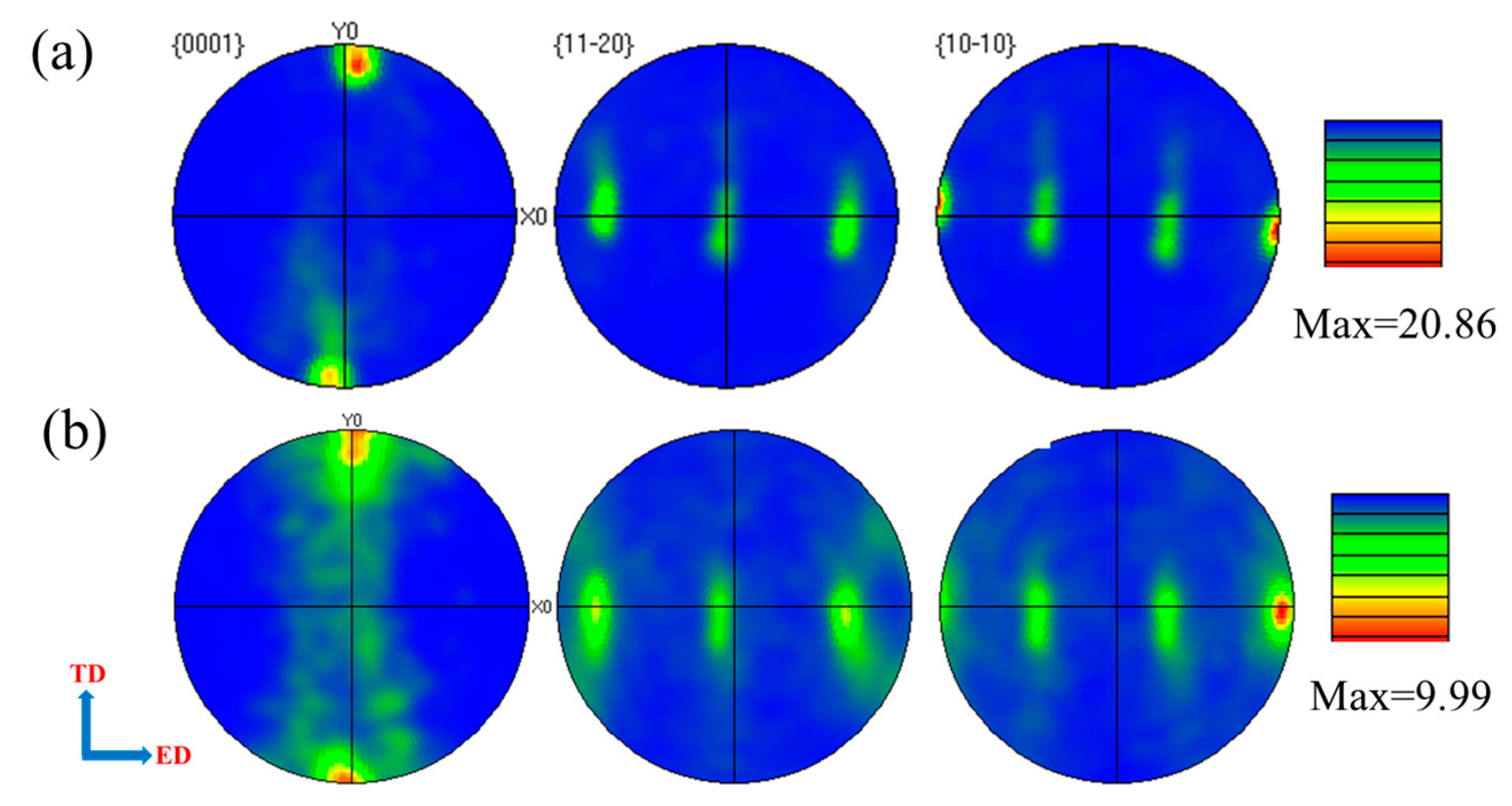Pole figures of extruded Mg-0.4Al-0.3Ca-0.2Mn-xSn alloys (x = 0, 0.1 wt.%): (a) x = 0; (b) x = 0.1.