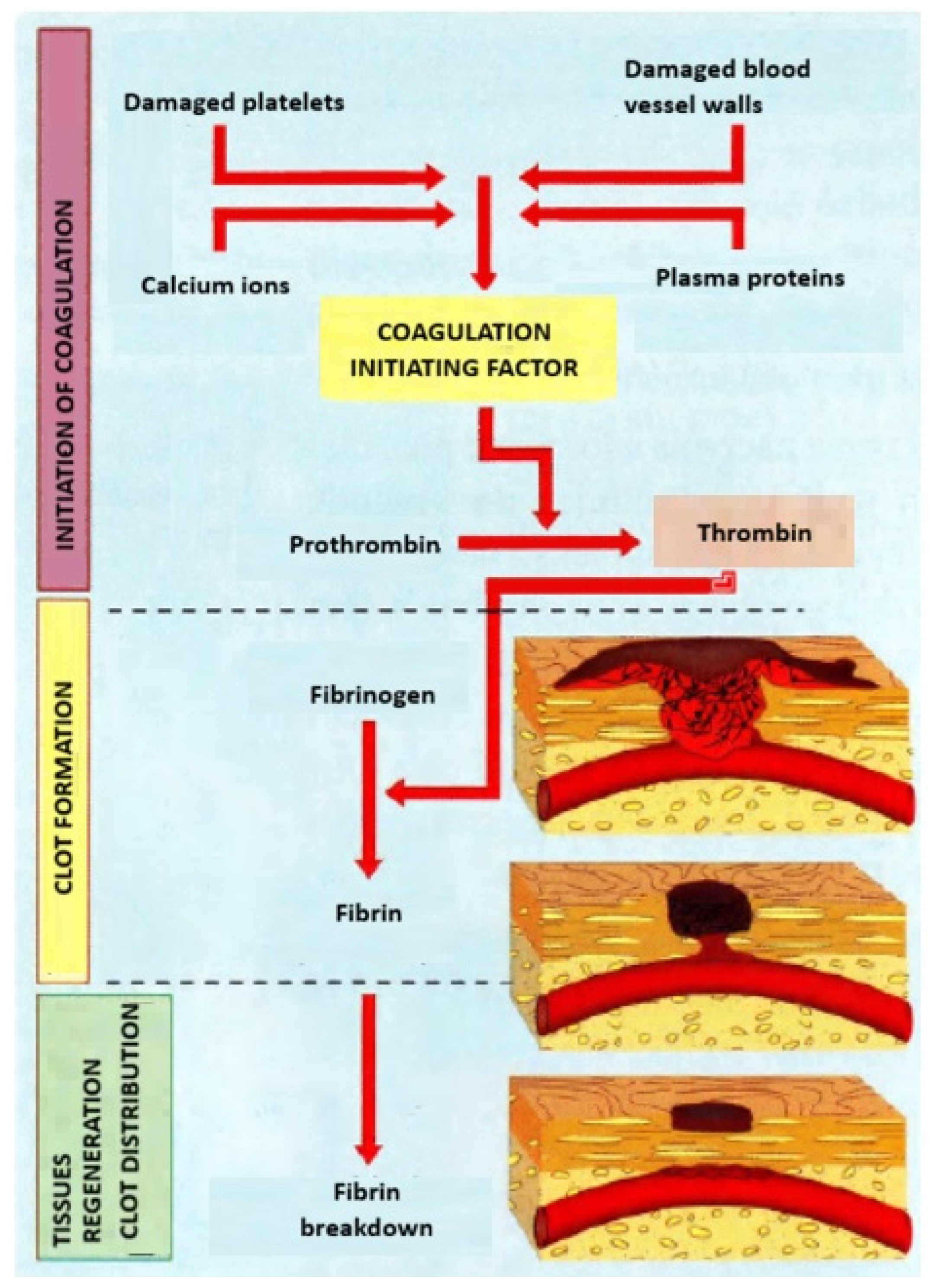 - Weisel, J.W.; Litvinov, R.I. Fibrin Formation, Structure and Properties. In Fibrous Proteins: Structures and Mechanisms; Subcellular Biochemistry; Springer: Berlin/Heidelberg, Germany, 2017; Volume 82, pp. 405–456. [Google Scholar]