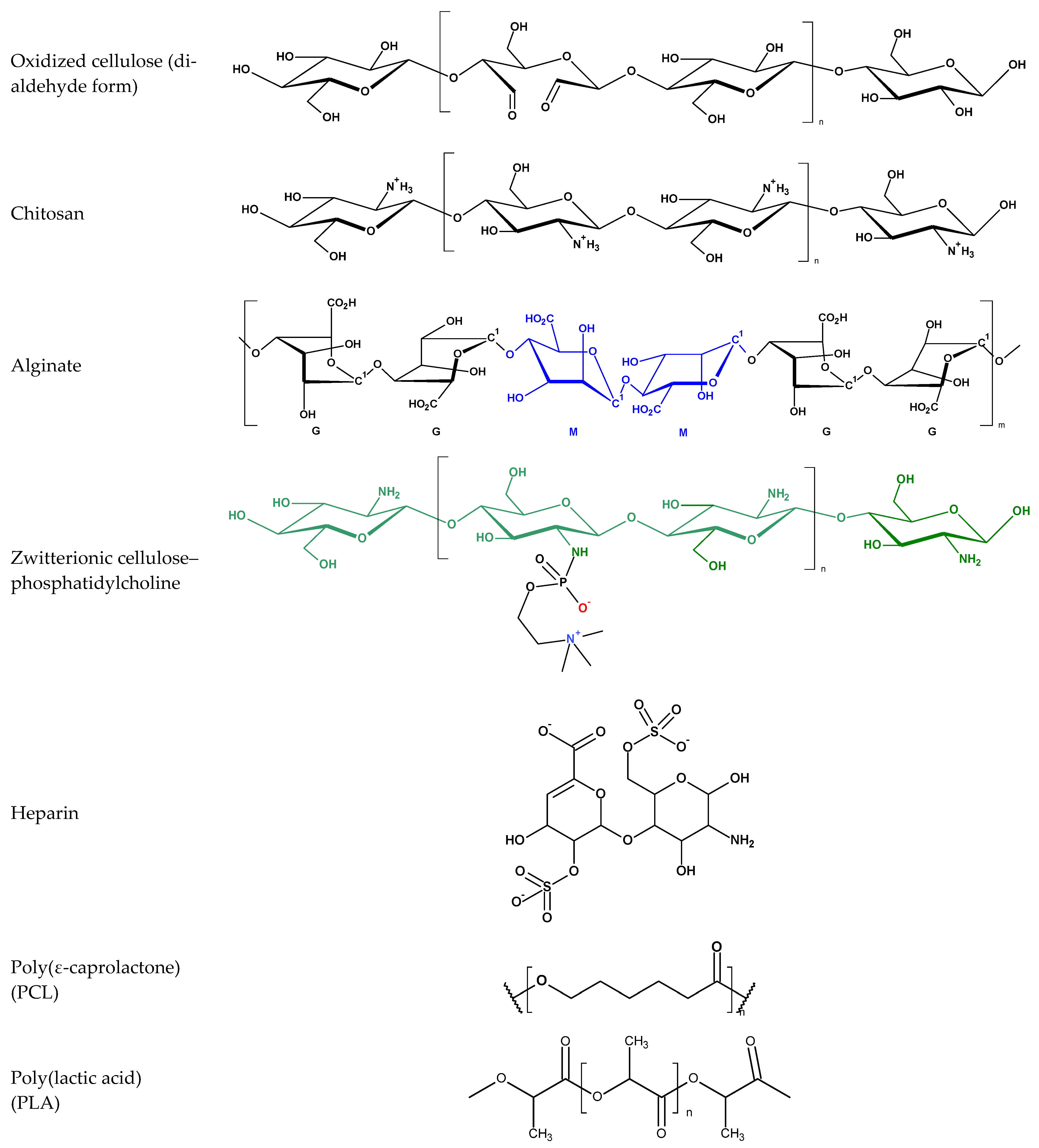 | Alginate | -COO− (carboxylate, Ca2+-crosslinked) | Negative (anionic) | Releases Ca2+; accelerates FX activation and fibrin polymerization; may trigger mild contact activation | [26,27,52,53] |