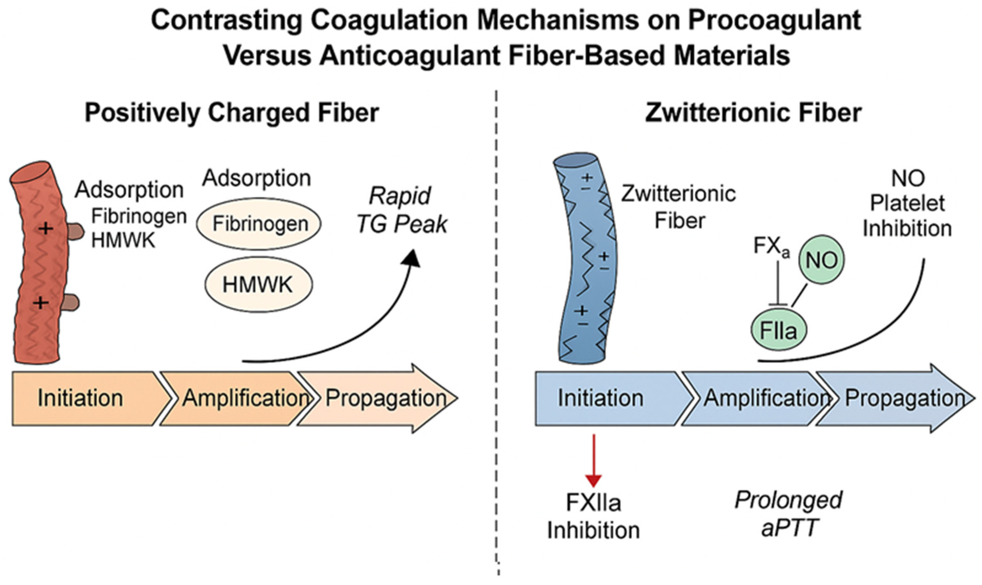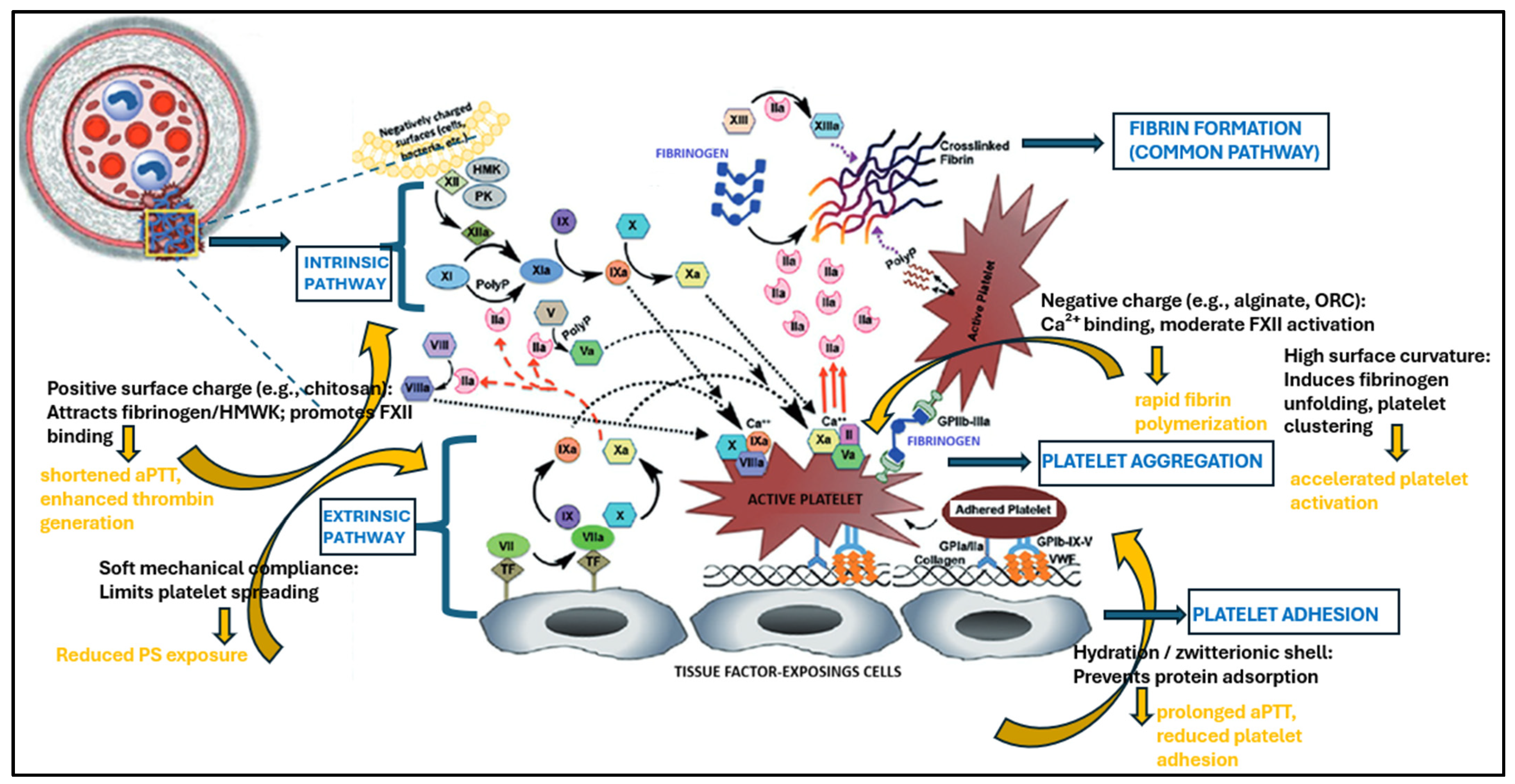 | Positive surface charge (e.g., chitosan) | Attracts fibrinogen/HMWK; promotes FXII binding | Shortened aPTT; enhanced thrombin generation | [4,9,27] |