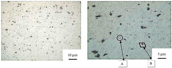 Optical micrographs of the aluminum alloy skins used in the sandwich panels, taken at different magnifications (left 500×, right 1000×). (A) Fe-rich and (B) Mn-rich particles.