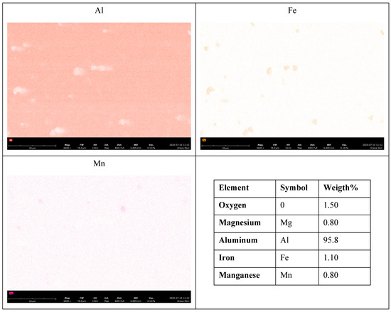 To complement the morphological analysis, a qualitative chemical assessment was performed using Energy-Dispersive X-ray Spectroscopy (EDS) (SEM Phenom XL G2, Alfatest, Eindhoven, The Netherlands). Figure 4 shows an EDS spectrum corresponding to points A and B of the micrographs in Figure 3. Aluminum is clearly the dominant element, accompanied by iron (Fe) in the bright particles (A), corresponding to Fe-rich intermetallic phases, and by manganese (Mn) in the particles (B), corresponding to Mn-rich phases (Mn-Al6), in agreement with literature data [20].