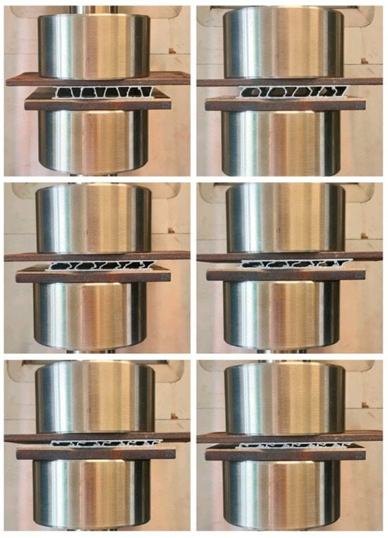 Compression tests were carried out with an MTS Insight universal testing machine with a maximum load capacity of 50 kN calibrated according to ASTM E4-24 [22] (equivalent to Class 1 ISO 7500-1:2018 [23]). The tests were performed under crosshead-control mode, applying a constant crosshead speed of 5 mm/min. The samples were compressed between two steel plates, ensuring a uniform load distribution on the top and the bottom surfaces. Figure 7 shows a typical deformation sequence captured during the compression.