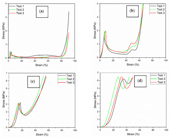 For each geometric configuration (defined by the thickness of the outer face sheets), three specimens were tested to assess the repeatability of the results. Stress–strain curves were derived from the force–displacement data, normalized by the cross-sectional area and initial specimen height.