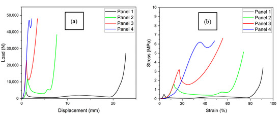 During the tests, force and displacement were continuously monitored and recorded. The acquired load–displacement data were converted into engineering stress–strain curves by considering the external sectional area of the sandwich panels (panel area values, Aext, reported in Table 1). The engineering stress and strain were calculated as in Equations (1) and (2):