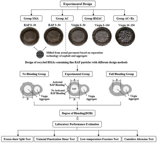 Figure 1 illustrates the design flowchart of this research. Four groups of recycled HMAs containing fine RAP particles were designed with different methods, including Group SMA, Group AC, Group HMAC, and Group AC+Re. To quantify the DoB in each recycled group, four virgin specimen groups were additionally designed and prepared with evenly spaced equivalent asphalt contents. These were intended to simulate the varying degree of blending between RAP binder and virgin binder, encompassing scenarios from no blending to full blending, as well as two intermediate states. The DoB in each group is subsequently determined by comparing the measured volume properties of the recycled HMAs with those of the four calibrated groups. In addition, the performance of these four types of asphalt mixtures has also been evaluated in multiple aspects.
