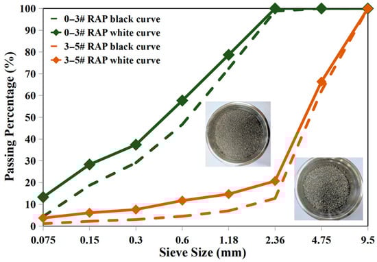 The RAP materials used in this research were milled and recovered from highways in Zhejiang Province, China, that had been in service for over 10 years and were processed using asphalt and aggregate separation technology. This separation technology primarily involved a rotor centrifugal crusher for refined separation and classification. The RAP materials included two size fractions, 0–3# (indicating a particle size range of 0.075–2.36 mm) and 3–5# (indicating a particle size range of 2.36–4.75 mm). A fully automatic extractor and an Absten device were utilized to recover the RAP binder from reclaimed materials. The gradation characteristics of the two fractions of RAP materials before and after extraction are shown in Figure 2. It can be observed that there are significant differences in the gradation of the two RAP materials before and after extraction. The differences in gradations are primarily attributed to the asphalt binder film coating the RAP aggregates and some agglomerations formed by fine particles in the unextracted RAP materials. Additionally, the pertinent properties of RAP binder were measured. The asphalt content, expressed as a percentage by weight of the dry aggregate, for the 0–3# RAP and 3–5# RAP was determined to be 8.5% and 3.4%, respectively. Correspondingly, the penetrations of these two fractions of RAP binders were recorded at 31 (0.1 mm) and 28 (0.1 mm), the softening point were recorded at 56.2 °C and 56.0 °C, and the ductility is 4.6 cm and 5.0 cm, respectively.