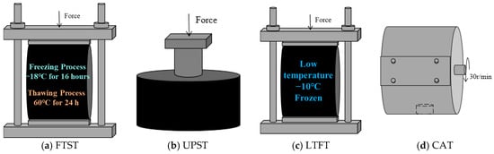 In this research, a thorough series of performance evaluations were conducted on each group of recycled HMAs. The tests included the freeze–thaw splitting test (FTST), uniaxial penetration shear test (UPST), low-temperature fracture test (LTFT), and Cantabro abrasion test (CAT). All these assessments were carried out in strict accordance with the standard test method (JTG/E20-2011) [23]. The test devices are presented in Figure 6. A minimum of four parallel specimens were prepared for each group. The tensile strength ratio (TSR) was employed to assess the water stability of the recycled HMAs. The shear strength (Rτ) served as an indicator of the high-temperature performance. The fracture energy (Gf) and fracture strength were utilized to evaluate the low-temperature resistance of the recycled HMAs. Meanwhile, the percentage loss (ΔS) was used to describe the abrasion resistance of the recycled HMAs. These indicators were calculated according to Equations (5)–(9).
