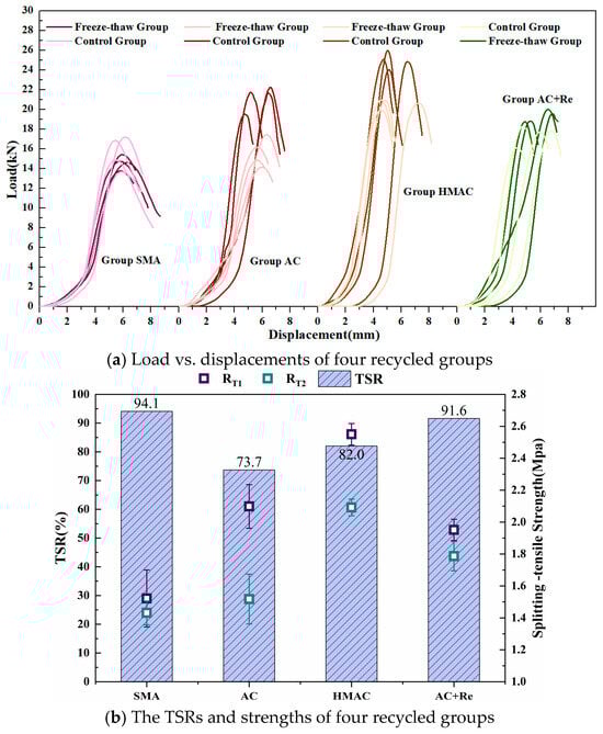 Figure 7a illustrates the load–displacement curves obtained from the four groups of freeze–thaw splitting tests (FTSTs). Correspondingly, Figure 7b displays the splitting tensile strength results (RT1 and RT2) both prior to and following the freeze–thaw cycle, along with the TSR. Additionally, a significance analysis was conducted on these indicators using the Tukey pairwise comparison method, employing a 95% confidence interval. The outcomes of this analysis are detailed in Table 5.