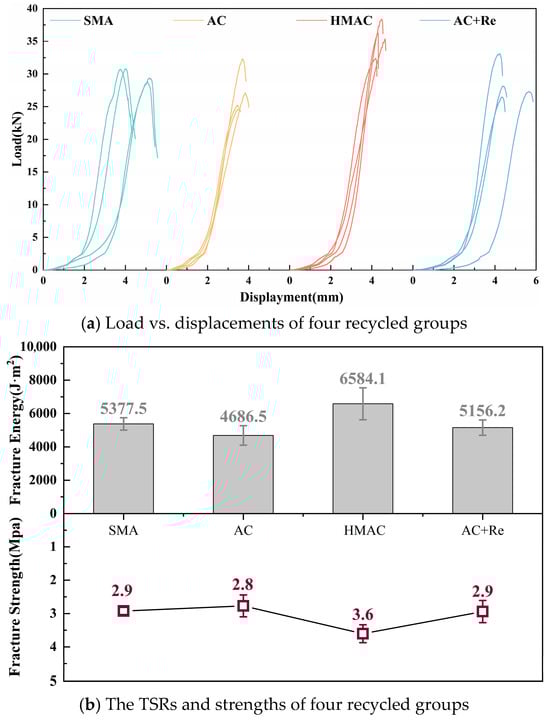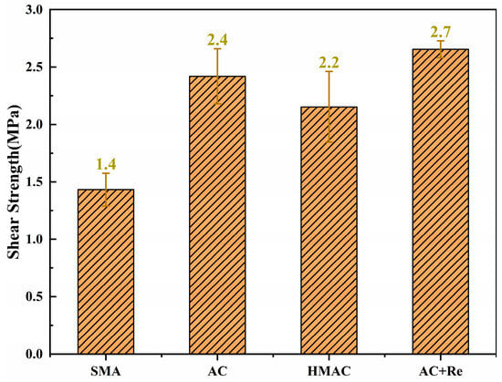 It can be observed that Group AC in this research showed a high shear strength of 2.4 MPa. The addition of modified rejuvenator may further facilitate the blending at the interface between RAP and virgin binder, thereby enhancing the shear strength of recycled HMAs. Specifically, here, Group AC+Re exhibited a 10% increase in shear strength compared to Group AC, with an improvement of 0.2 MPa. In addition, due to the increased asphalt content and reduced air voids, Group HMAC showed a shear strength of 2.2 MPa, which was slightly lower than that of the former groups, yet there was no significant statistical difference when compared to Group AC. Moreover, Group SMA showed the lowest shear strength among the groups though still relatively high at 1.4 MPa. Traditionally, virgin HMAs designed using the SMA method tended to have superior high-temperature performance compared to those designed using the AC method. However, in this instance, the inclusion of fine RAP particles and the use of SBS modified binder in both groups allowed them to possess adequate shear strength. Moreover, likely a result of the gradation characteristics of Group SMA that necessitated 0.91% more asphalt content in its design compared to Group AC, the shear strength of Group SMA was relatively lower.