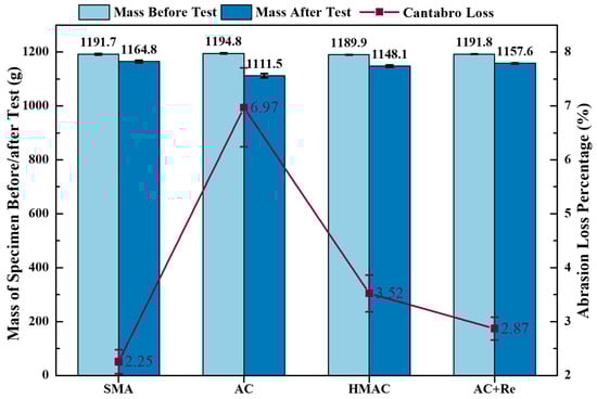 The condition of the recycled specimens after 300 revolutions in the Cantabro abrasion test are presented in Figure 10, and the results of abrasion loss percentage are illustrated in Figure 11. A significance analysis of these indicators was conducted using the Tukey pairwise method, and the significance analysis results are listed in Table 8.