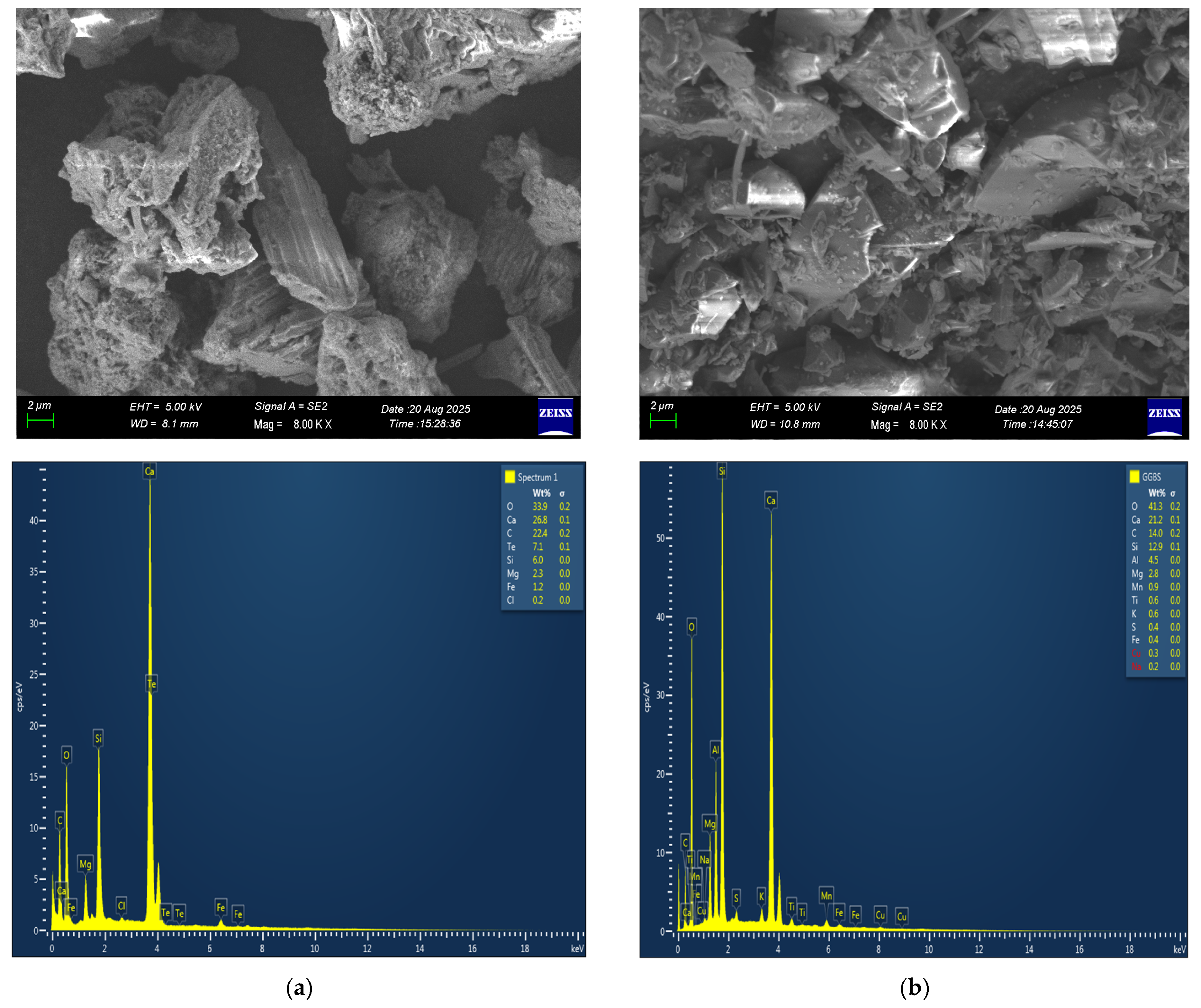 - Lu, P.; Zhao, Y.; Zhang, N.; Wang, Y.; Zhang, J.; Zhang, Y.; Liu, X. Structural characteristics and cementitious behavior of magnesium slag in comparison with granulated blast furnace slag. Materials 2024, 17, 360. [Google Scholar] [CrossRef]