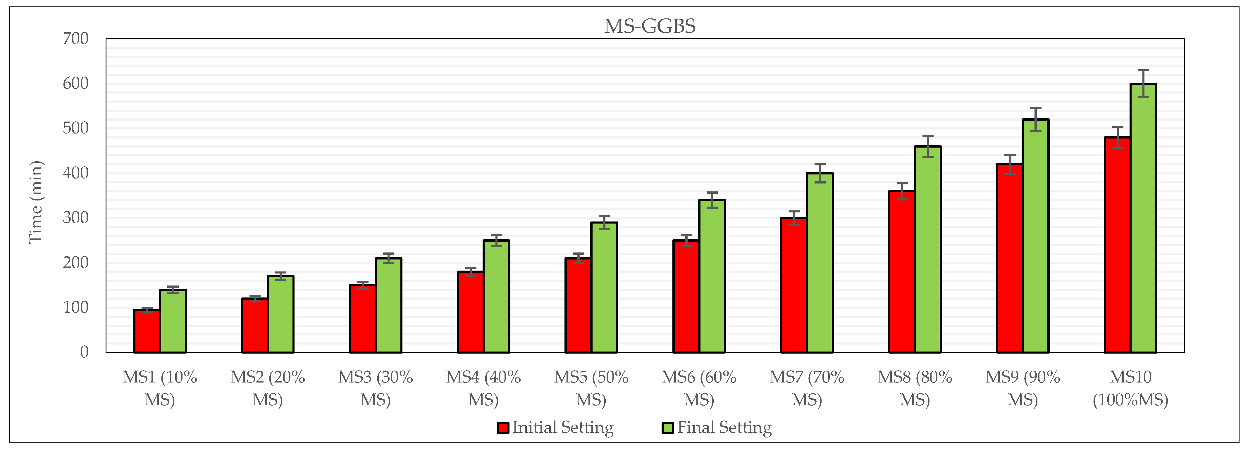 - Setting time regulation: MS acts as an effective setting retarder in OPGC systems. The final setting time was extended by 320% when GGBS was fully replaced by MS. This finding is crucial for practical engineering applications, as it demonstrates that MS can be strategically used to control the rapid setting characteristic typically associated with alkali-activated GGBS concretes.