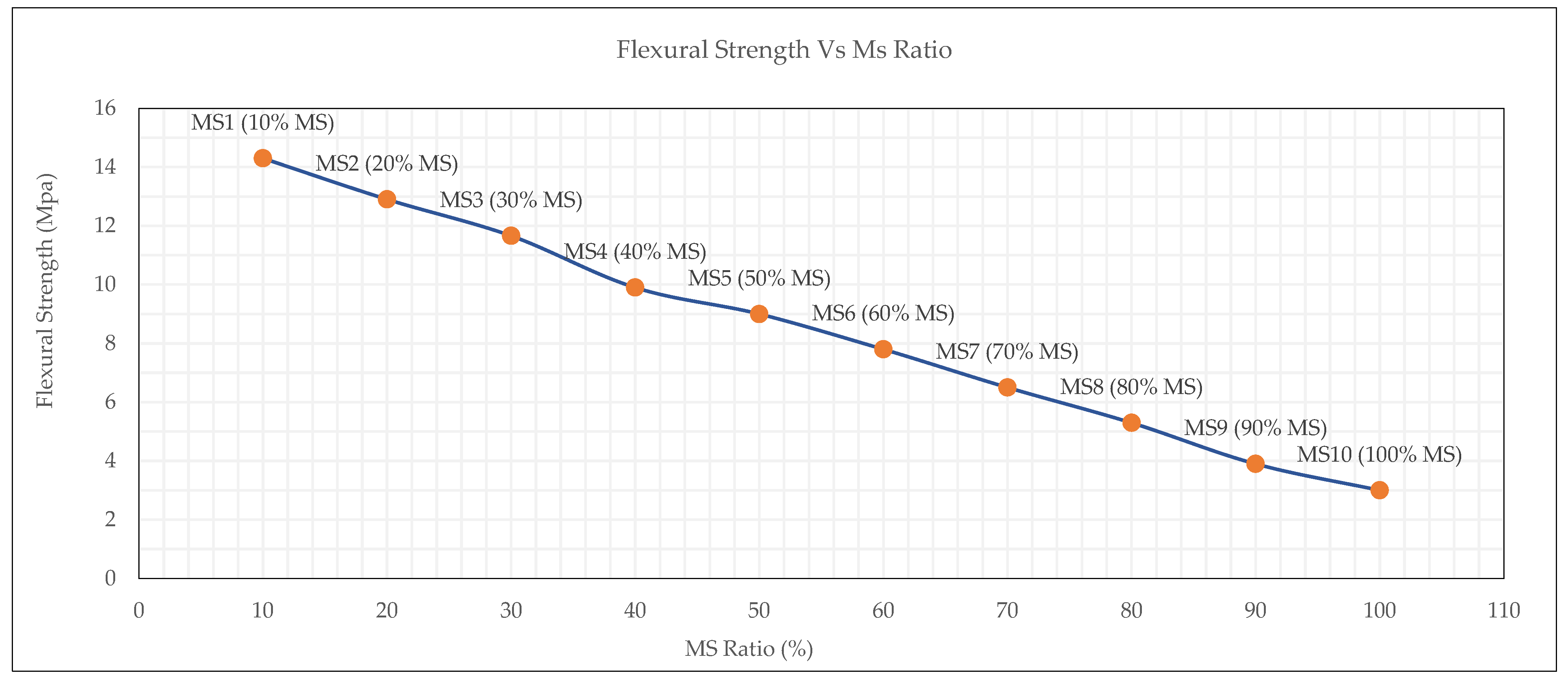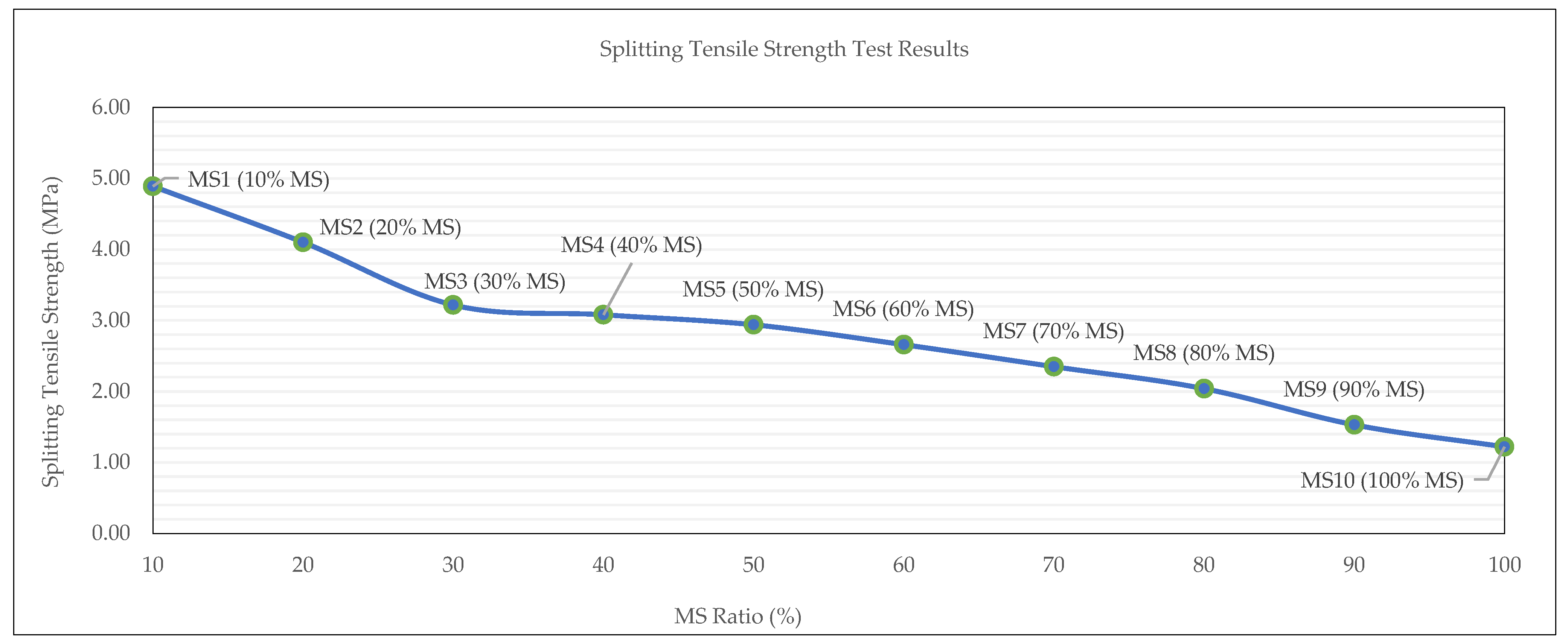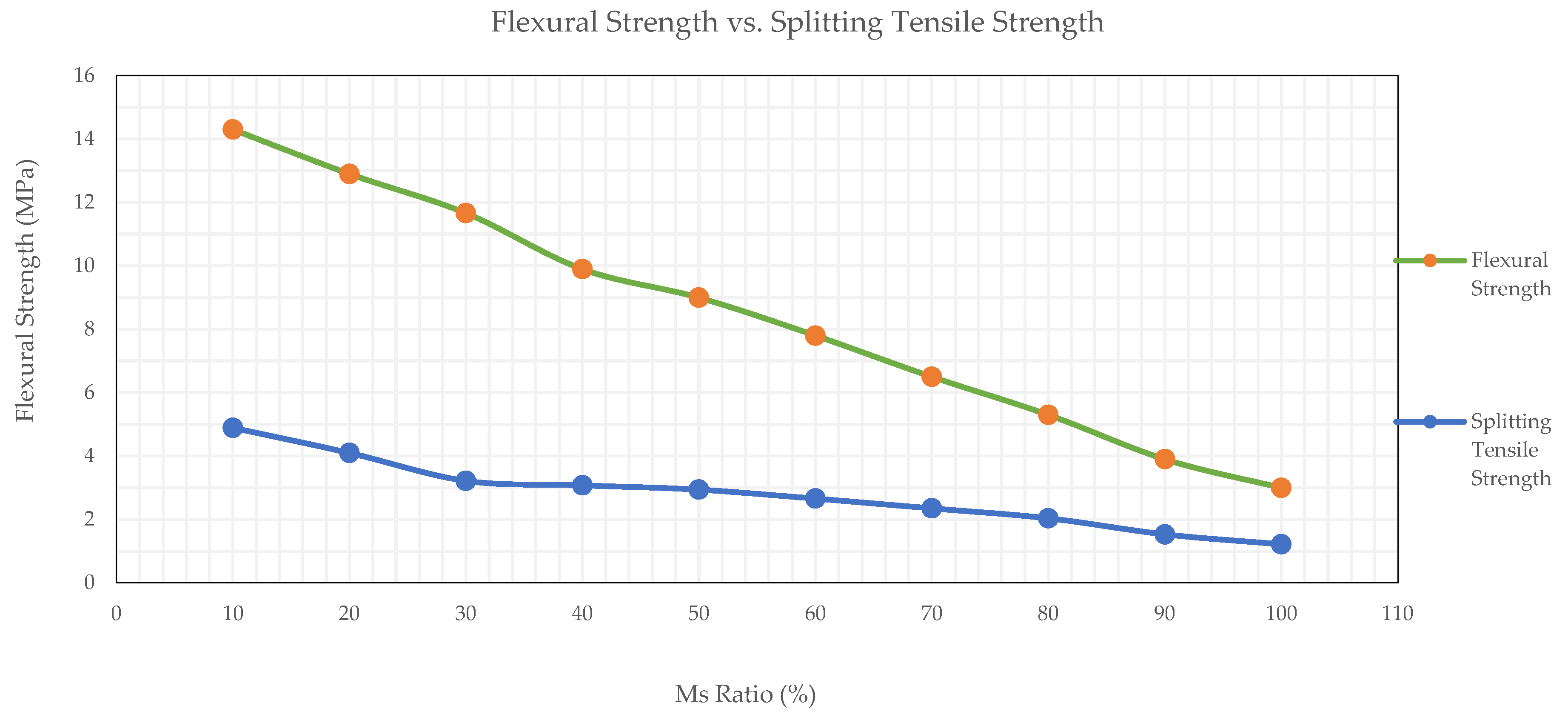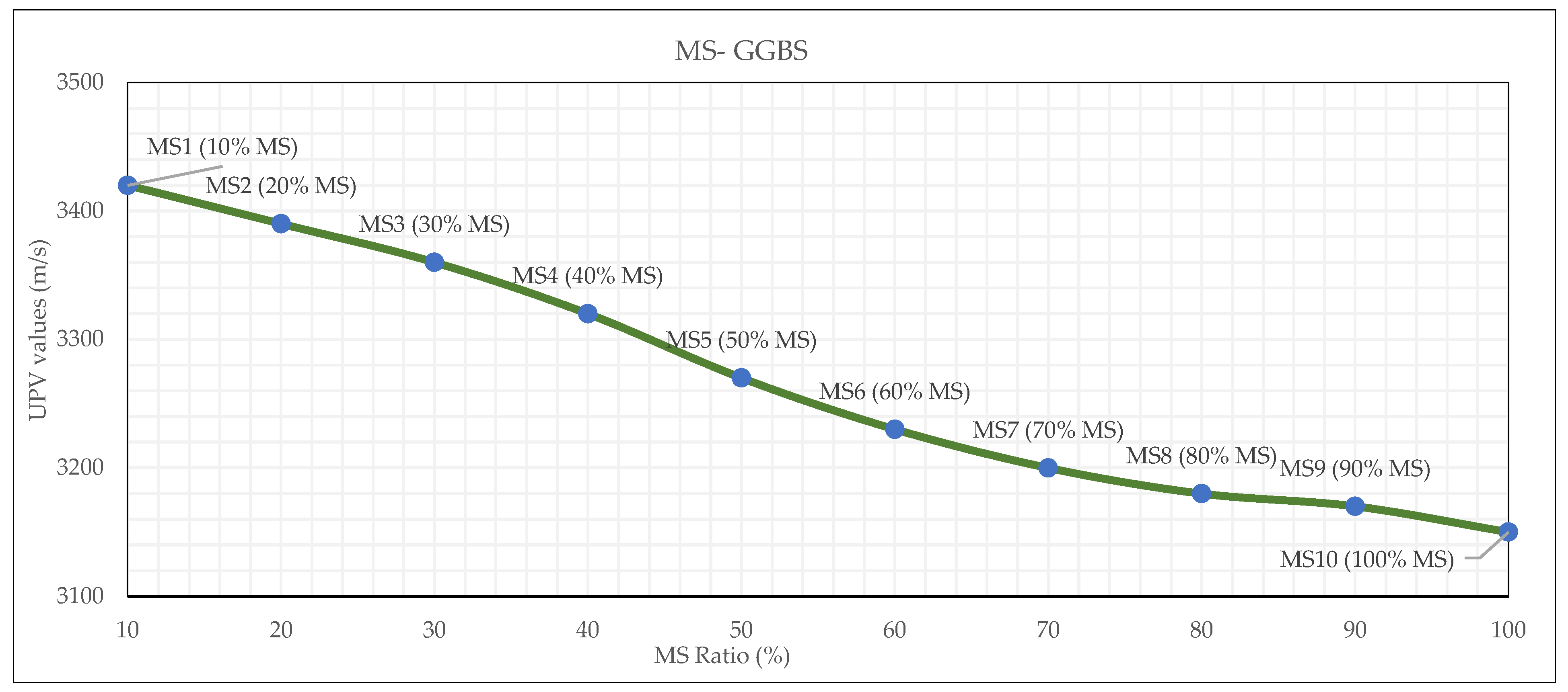 - Mechanical performance and matrix integrity: a strong correlation was established between density, ultrasonic pulse velocity (UPV), and mechanical strength. Although a steady decline in density and UPV values was observed starting from 10% MS, the impact of this reduction became critical beyond the 30% threshold. The inclusion of MS beyond this limit led to a more pronounced loss of matrix cohesion and increased porosity, as evidenced by the sharper drop in UPV. Splitting tensile and flexural strengths followed a similar downward trend, confirming that excessive MS substitution compromises the tensile integrity of the binder, leading to a less dense and more brittle internal structure.
