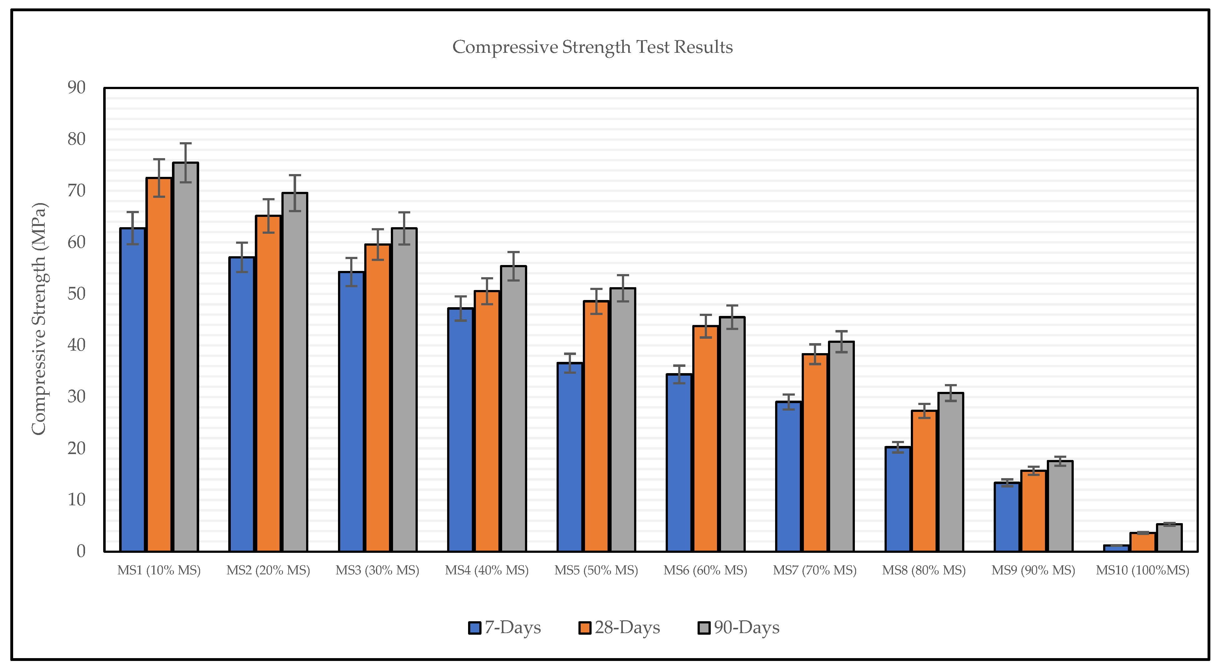 - Fresh state behavior and workability: increasing MS content positively influences the workability of OPGC, with slump values rising from 7 cm at MS1 (10% MS) to 14 cm at MS10 (100% MS). This trend is directly linked to the lower inherent cementitious activity and specific mineralogical structure of MS (Q0 and Q4 units), which reduces the immediate water demand compared to highly reactive GGBS-rich systems.