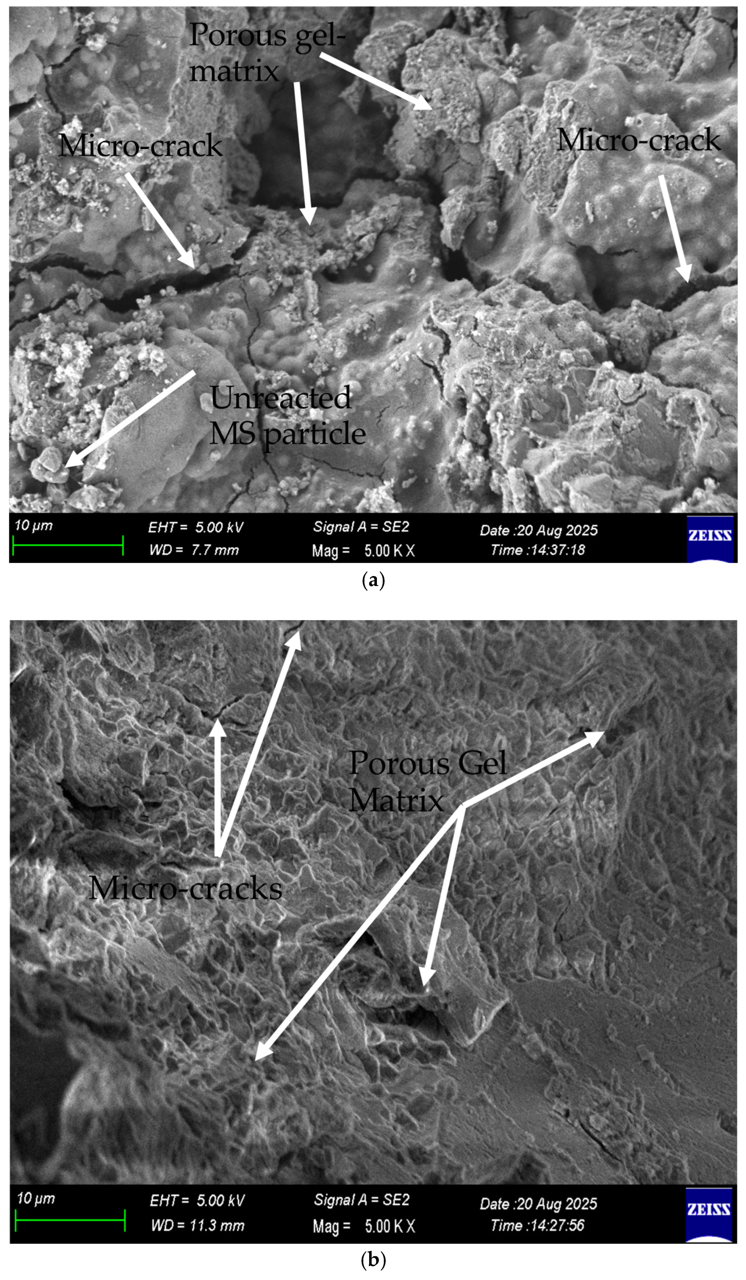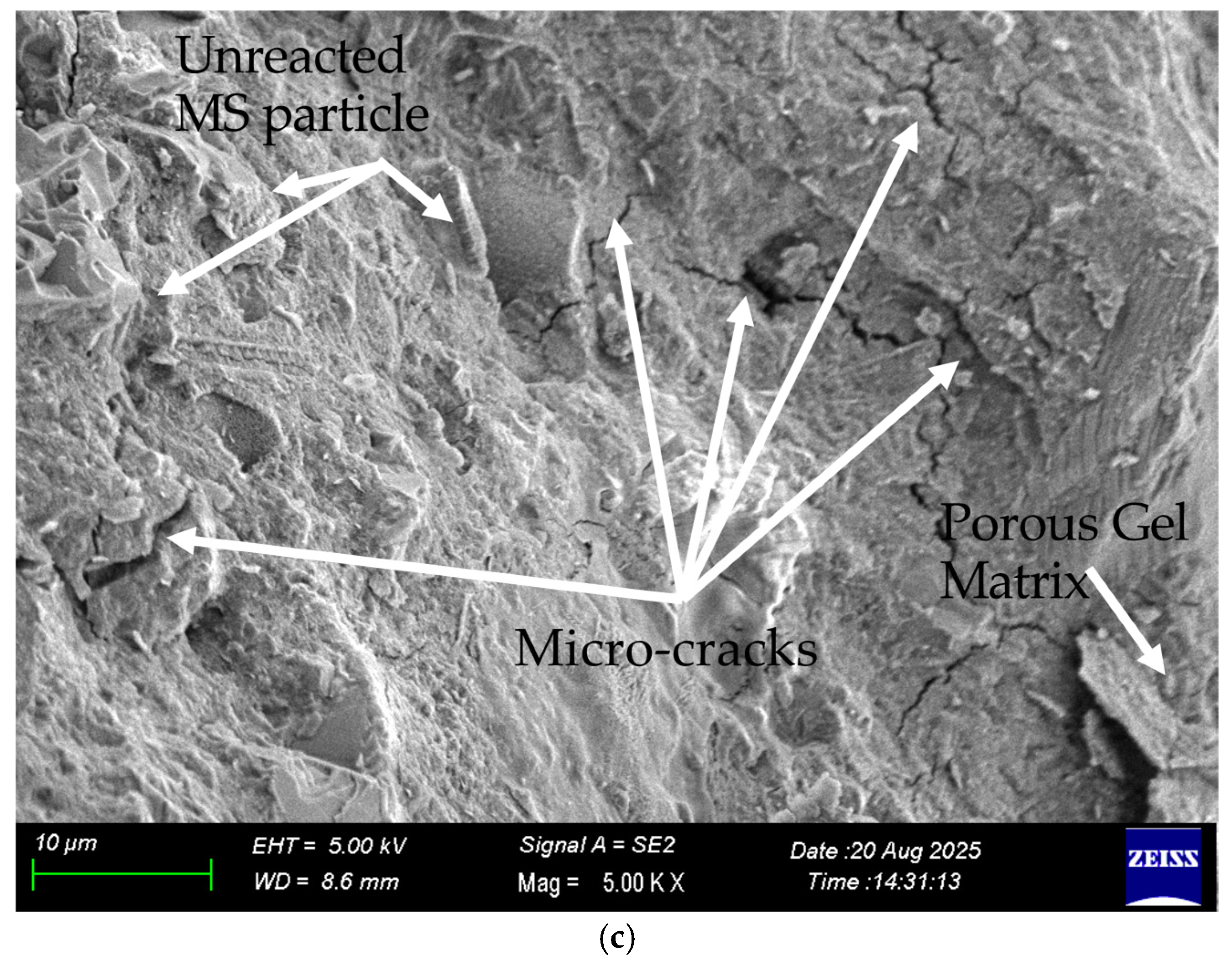- Microstructural validation: SEM analysis provided visual evidence of the 30% threshold revealing a dense and compact microstructure at MS3 (30% MS), whereas higher replacement levels exhibited microcracks and unreacted particles. While the MS30 specimen exhibited a dense, homogeneous C–(A)–S–H/N–(A)–S–H gel matrix, the MS50 sample showed pronounced micro crack-sand unreacted particles. This validates that sufficient calcium and reactive silica levels are maintained only at lower MS substitution ratios, ensuring a robust geopolymer network.