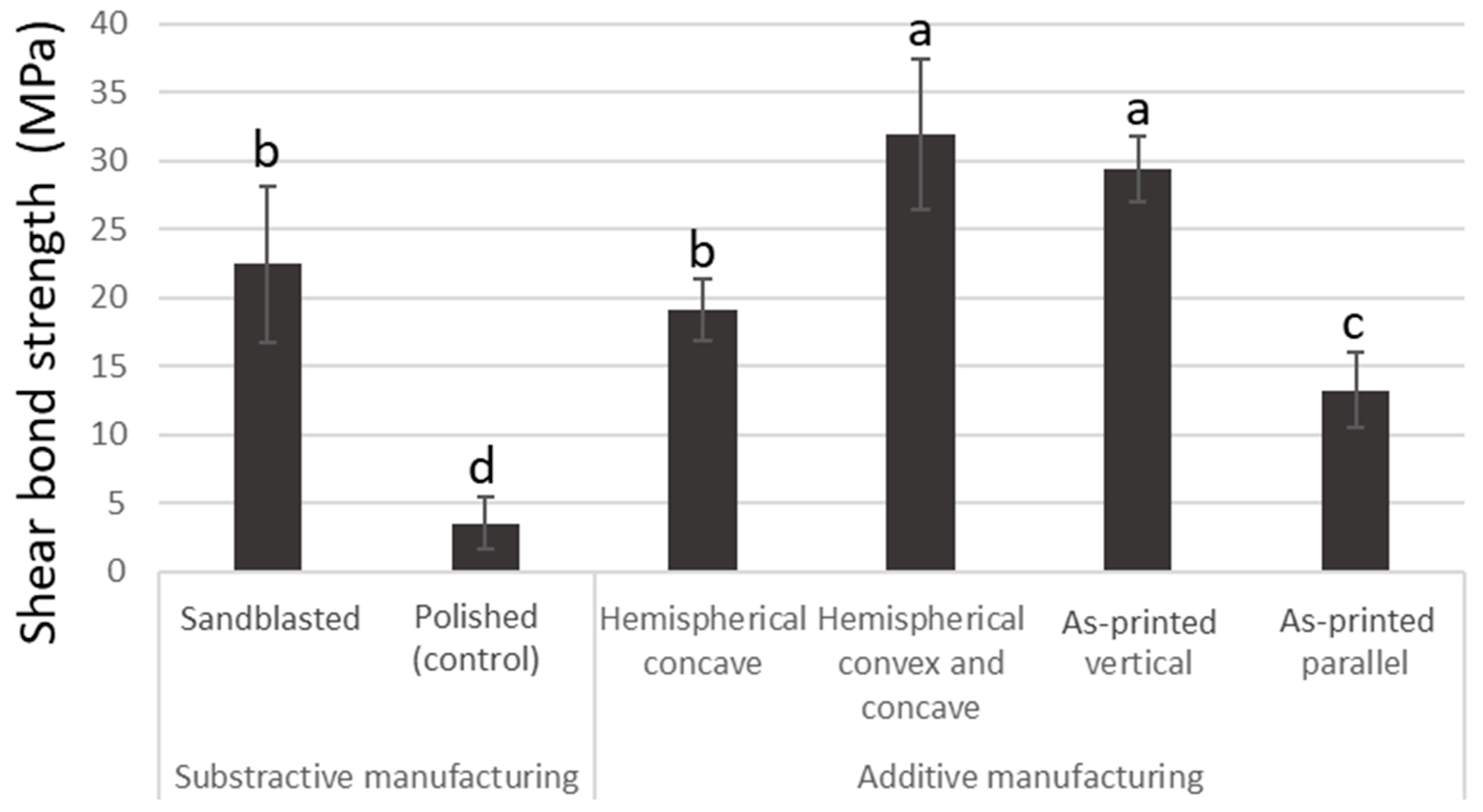 The specimens were mounted on a material-testing machine (Model 5565, Instron, Canton, MA, USA). In the additively manufactured groups, the mount orientation of the specimens was predetermined. For the hemispherical concave and hemispherical concave and convex specimens, shear stress was applied parallel to the printing layers. In the as-printed specimens, two types of shear loading were applied: one parallel and the other perpendicular to the printing layers. The shear stress was applied at a cross-head speed of 0.5 mm/min. After SBS testing, all failed specimens were analyzed using a light microscope (40×) (SMZ-10, Nikon, Tokyo, Japan) to assess the fracture pattern, which was used to classify the samples as having failed “cohesively”, “adhesively”, or “mixed” (involving both cohesive and adhesive failure regions). For statistical analysis, one-way analysis of variance (ANOVA) followed by Tukey’s multiple comparison test was used with α = 0.05.
