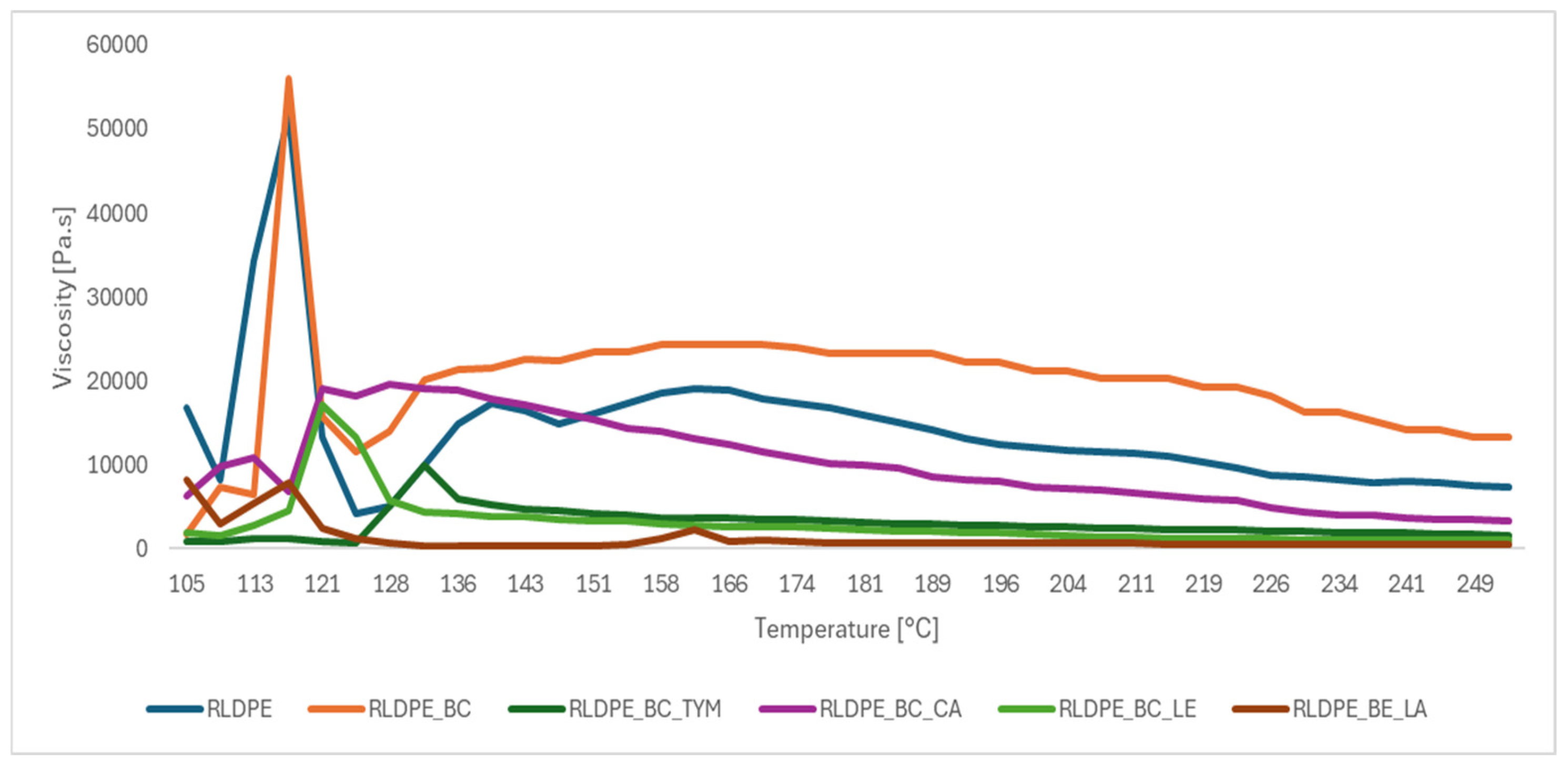 When natural additives are incorporated into the biochar-filled matrix, the viscosity curves shift downward, indicating a partial recovery of melt flow. The strongest reduction is observed for the lanolin-modified composite (RLDPE_BE_LA), which achieves the lowest viscosity over most of the examined temperatures. This behavior reflects the marked plasticizing action of lanolin, likely associated with its ability to penetrate between polymer chains and locally decrease cohesive interactions. Lecithin and thymol also lower viscosity relative to the biochar-only sample, although to a lesser extent, suggesting moderate chain-lubricating effects. In contrast, cetyl alcohol (RLDPE_BC_CA) displays a more complex profile, providing only partial viscosity reduction and maintaining a more stable plateau, which may be linked to its dual role in both plasticizing the polymer matrix and reinforcing interfacial interactions with the filler.
