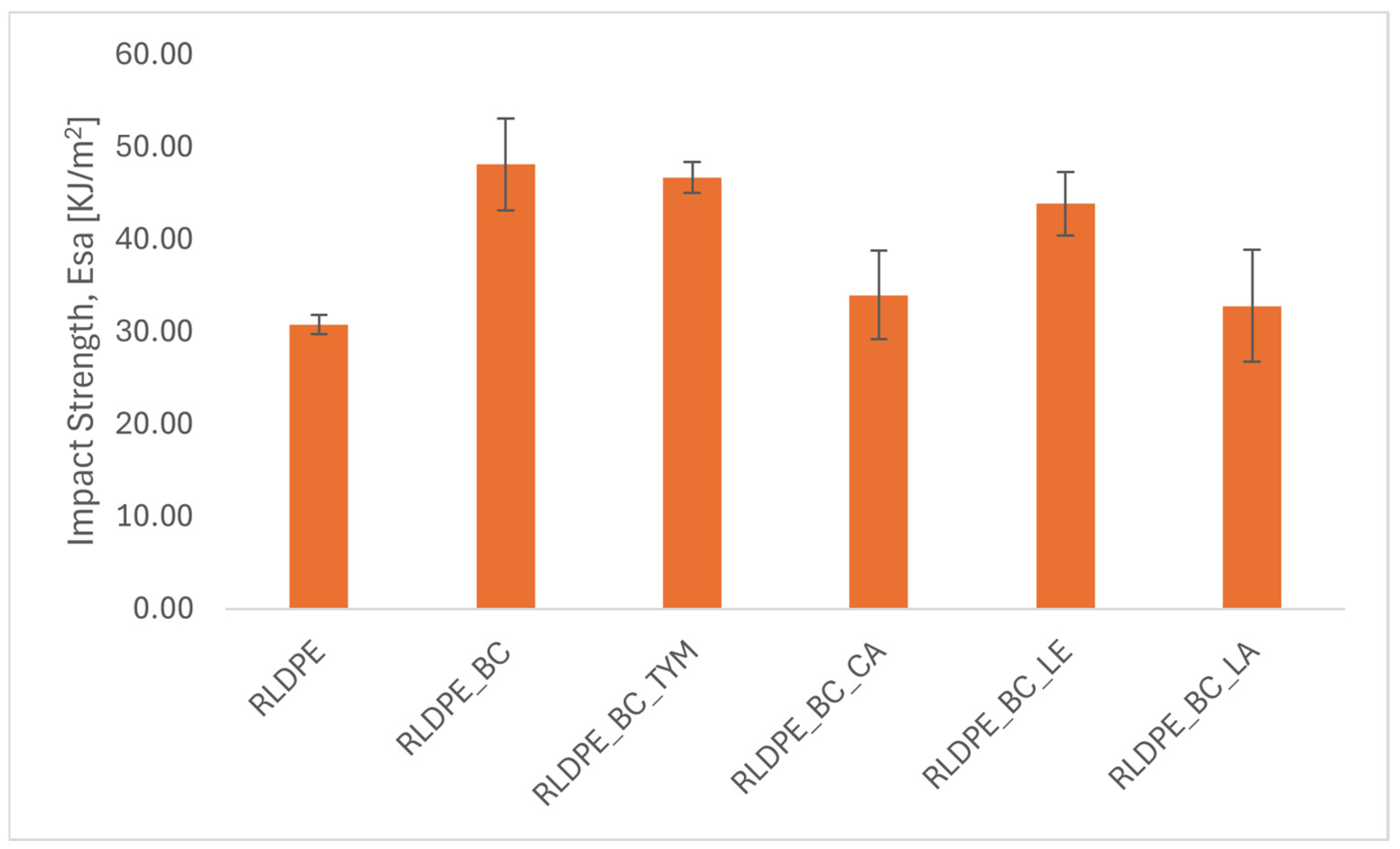 Natural additives produced variable effects. Thymol and lecithin maintained relatively high impact strength (46.7 kJ/m2 and 43.8 kJ/m2, respectively), suggesting that these modifiers do not adversely affect impact resistance. Lanolin, however, reduced the impact strength to 32.8 kJ/m2, reflecting its pronounced plasticizing effect.