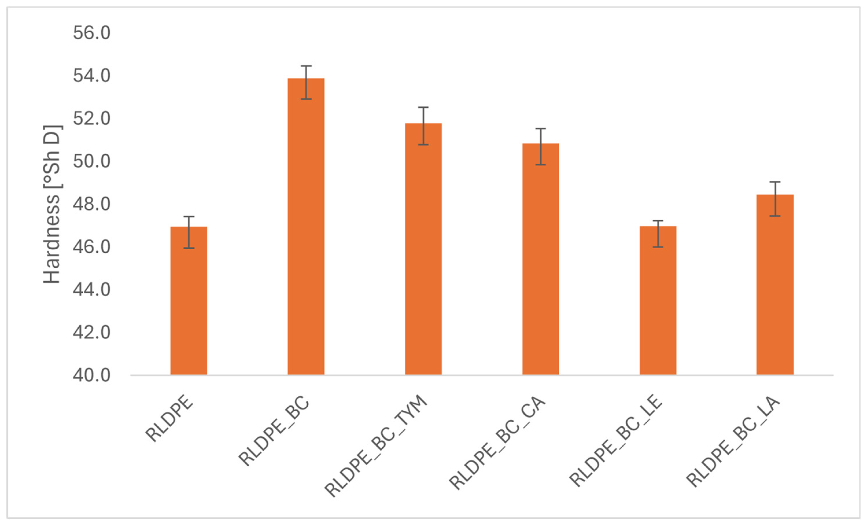 The reference sample, consisting solely of polyethylene, exhibited the lowest hardness value (47 ± 0.5 ShD), confirming that pure polyethylene is a relatively soft material with low resistance to local surface deformation.