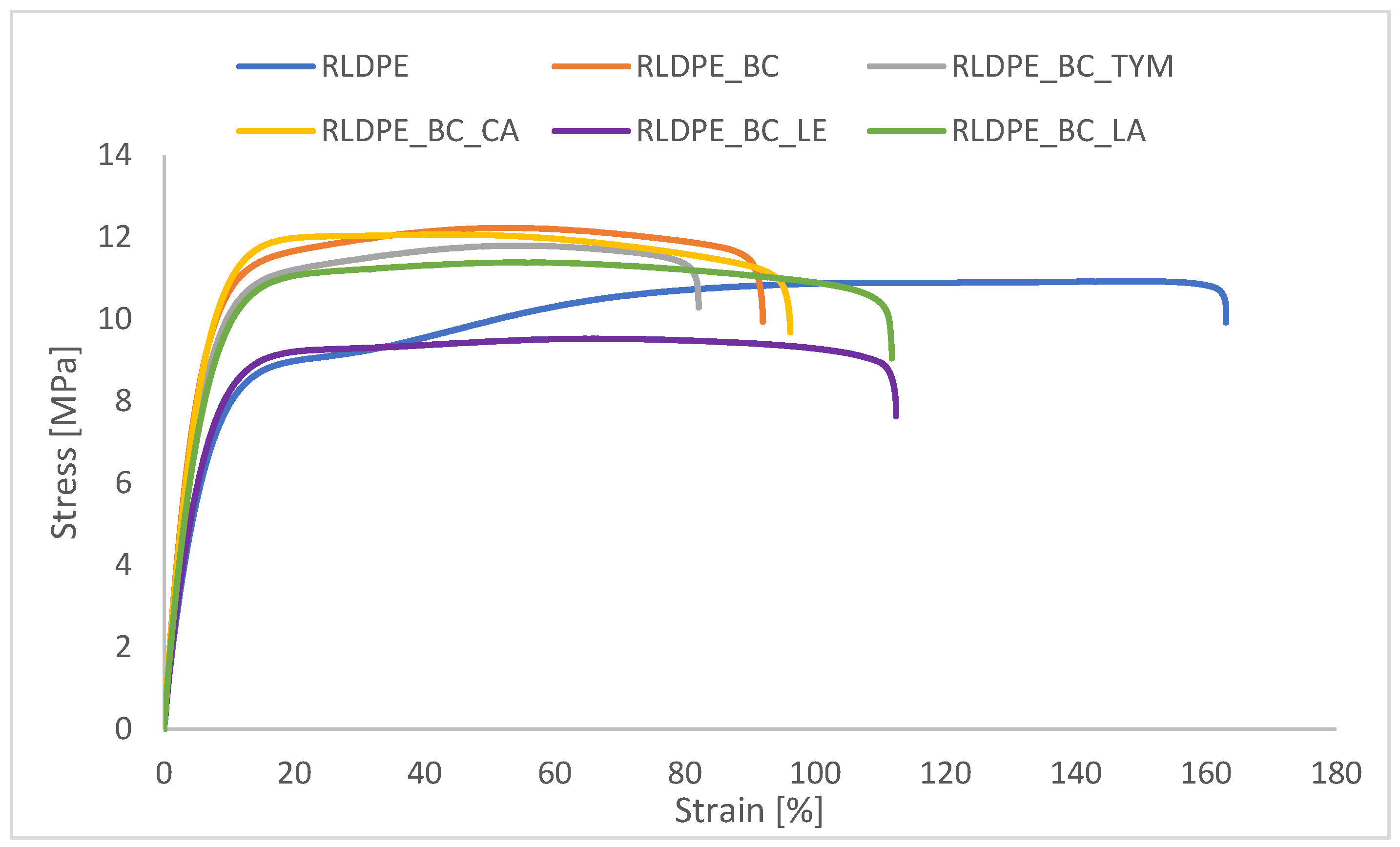 Table 4. The addition of biochar slightly increased the true stress at maximum load (from 11.6 MPa to 12.2 MPa) but significantly reduced the true strain at maximum load (from approximately 150% to 54%), indicating a marked loss of ductility and increased brittleness resulting from restricted polymer chain mobility. Thymol and cetyl alcohol had a minimal effect on Tfmax and Efmax values before aging, producing results comparable to the biochar-filled composite. Lanolin enhanced ductility without significantly compromising strength, confirming its moderate plasticizing behavior. In contrast, lecithin caused a noticeable reduction in true stress at maximum load, suggesting limited interfacial compatibility and possible phase separation.
